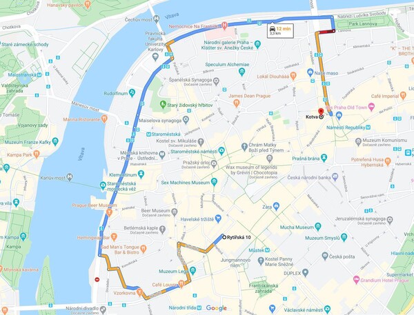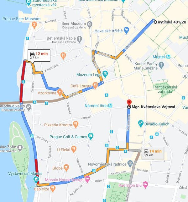5. 6. 2020, 16:30Pěšky je to stejně daleko, autem sice blíž, ale taky hezký okruh. (a ano, Google nás z nepochopitelných důvodů taká skrz ulici Karolíny Světlé, kde je zákaz, namísto odbočení vlevo u Národního divadla, které je legální, ale to absurditu té skoro tříkilometrové anabáze nijak podstatně nevylepší....)
