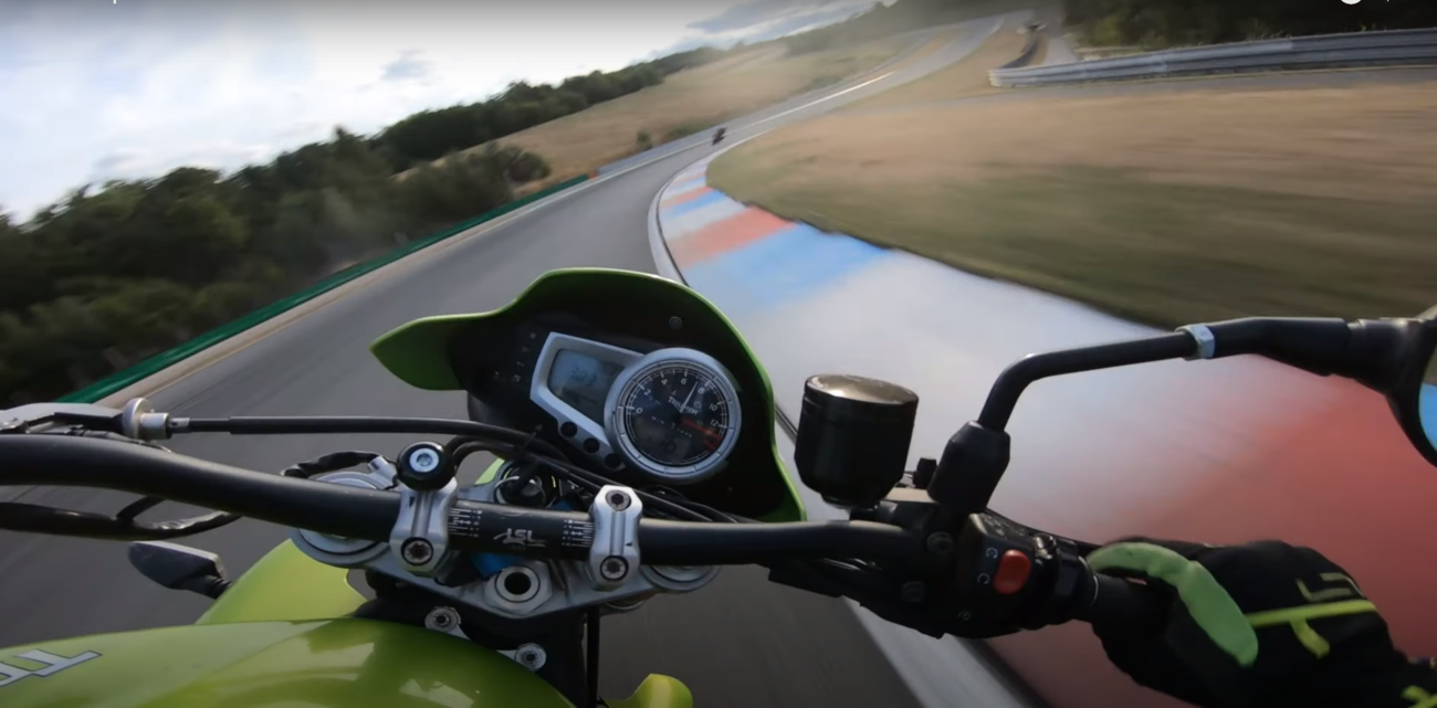 S kolenem na zemi už jsem jel několikrát, ale nyní v téhle pozici poprvé driftuji. Nebudu lhát. Bylo to cool jak sviňa, akorát nejsem žádný Marquez, takže jsem fakt nevěděl co s tím. Plyn jsem zavřel, rychlost klesala a pak se motorka na malý okamžik srovnala. Jenže náklonu bylo stále příliš, ale rychlost už moc nízká, tak mi to prostě upadlo. Vzít přesně v tomto momentě znova za plyn, možná byste si (hned druhý den) přečetli jak s Marquezem vytírám podlahu!