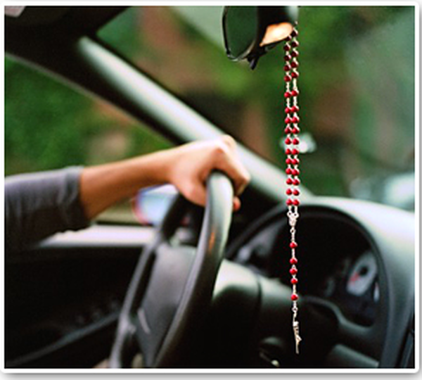 Fiat 500 s položenou mitrou na sedadle řidiče, vyčnívající berlou ze střechy a ornátem a dalmatikou na zadních sedadlech (Dívka na koštěti)