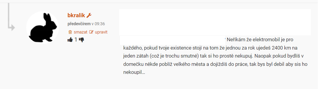 A co se týče toho tvého komentáře - přijde mi, že mě tam zase manipuluješ do nějaké pozice obskurního podivína s extrémně vyhraněným způsobem používání aut (musíš mít jedno auto, dva kočárky, projíždět se...). To je ale jednak v přímém rozporu s tím co jsem napsal do článku, a jednak to není vůbec pravda, protože stačí jedna z těchto podmínek které jsou u lidí troufnu si říct celkem běžné, a najednou elektromobil ztrácívelkou část potenciálu.