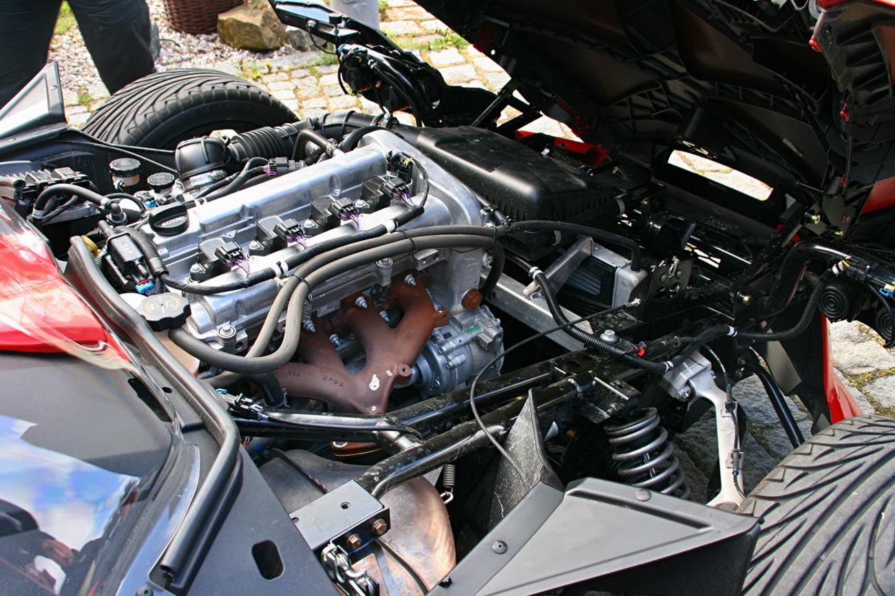 Stiskem ohromného červeného tlačítka, které vypadá jako vypínač od nukleární války, uvádím do chodu motor. Pod kapotou se neukrývá svým způsobem žádný zázrak. Je tu čtyřválec o objemu 2.4 litru s atmosférickým plněním, převzatý od General Motors. Na něj je napojená pětistupňová převodovka s vcelku přesným řazením, dále kardan a nakonec i kevlarový řemen, pohánějící zadní dvacetipalcové kolo na jednostranné kyvné vidlici.