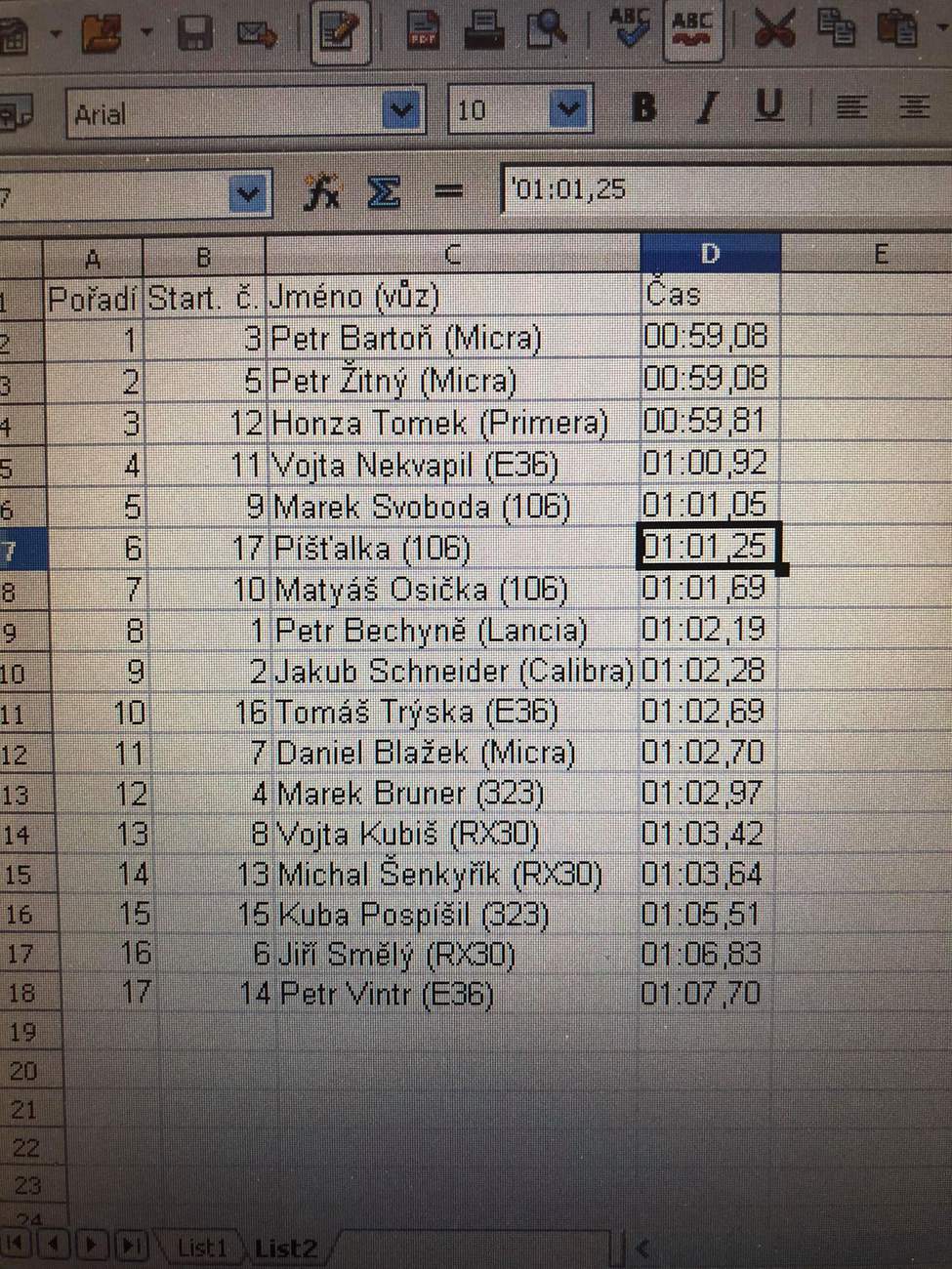 Startovní pole bylo tentokrát skutečně pestré, byla tu Mazda, jejíž rotační motor na první pohled až nápadně připomínal starší mnichovské čtyřválce, Nissan Micra s velkým brzdovým světlem a velkým motorem (a prakticky ničím mezi tím) či dokonce Lancia Delta, skutečná závodní legenda. První místo tentokrát vybojoval Petr Bartoň, druhý se umístil Petr Žitný. Oba zajeli vítězné časy na stroji vlastní konstrukce, který býval kdysi dávno Nissanem Microu. Značka Nissan si připsala další body i za třetí místo, které obsadil Honza Tomek s Nissanem Primerou. Ten patrně vůbec nepočítal s tak dobrým umístěním a tak odjel ještě před vyhlášením výsledků – cenu za třetí místo máš u nás, kdykoli se o ni přihlaš. Vítězům gratulujeme a i všem ostatním děkujeme za účast, byla to zábava.