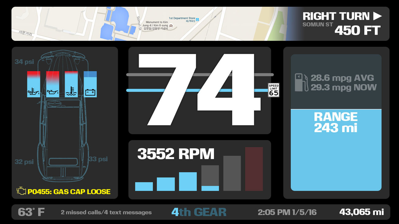 Začněme třeba tím, že bychom najednou mohli mít na palubní desce zobrazeno tolik přístrojů, kolik jen chceme. Kolik dnešních aut má alespoň teploměr vody, nebo dokonce teploměr či tlakoměr oleje? Kolik aut vám ukáže napětí v elektrické soustavě? Téměř žádné – a důvodem je to, že zájem zákazníků o takové informace není dostatečný na to, aby výrobce montoval další elektronickou ručičku s vlastním malým budíkem. Přitom ale každé moderní auto tyto informace měří a má je k dispozici. Stačí připojit se přes OBDII, nebo u moderních vozů se systémem SmartGate dokonce přes mobilní telefon, a vidíte údaje z kteréhokoliv čidla chcete. Plně digitální a individualizovatelná palubní deska by vám mohla umožnit zobrazit cokoliv chcete – ať už v libovolné grafické podobě, nebo třeba jako prostou sadu číselných údajů. Že se čísla čtou hůře než ručičky a nepoznáte tak snadno, že je něco špatně? Žádný problém, údaje mimo optimální rozsah mohou třeba zežloutnout či zčervenat.