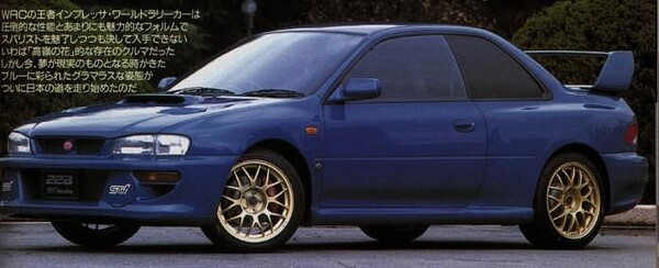 Připojím svůj tip. Potěšili mne japonské vozy ve výběru, ale ještě bych si přisadil. A to svou milovanou Imprezu 22B. V tmavě modré, tmavě šedých BBS-ech bez zadního sušáku na prádlo a zatmavěnými skly od B sloupku vzad. Decentní výfuk a minimální úpravy exteriéru. Co vy na to? Sám se duší cítím částečně jako blíže neurčitý druh gentlemena a tímto povozem bych se vozil velmi rád. I když bych asi lehce upravil podvozek, abych nemusel k chiropraktikovi každých 100km. ( k obrázku zapojte fantazii ;-) )