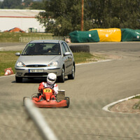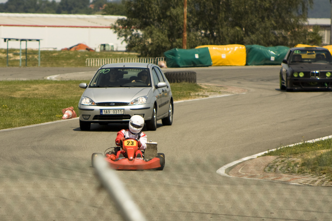 Evlo: ano, KZ2 bude s ostatníma. Už byla v Mýtě pokusně. Já na ní ujel asi pět kol a přišlo mi to naprosto v pohodě. Pak s ní jezdli kamarád, než rozpůlil zadní kotouč. Je nezbytně nutný, aby řidič motokáry nikoho nepodjížděl před zatáčkou. Na výjezdu je tak rychlej, že to auto ani nemá čas mu zkřížit dráhu. Každopádně, ještě to budeme ladit, určitě by stálo za zvážení mávat motokáru na trati, pokud to organizátoři zvládnou.