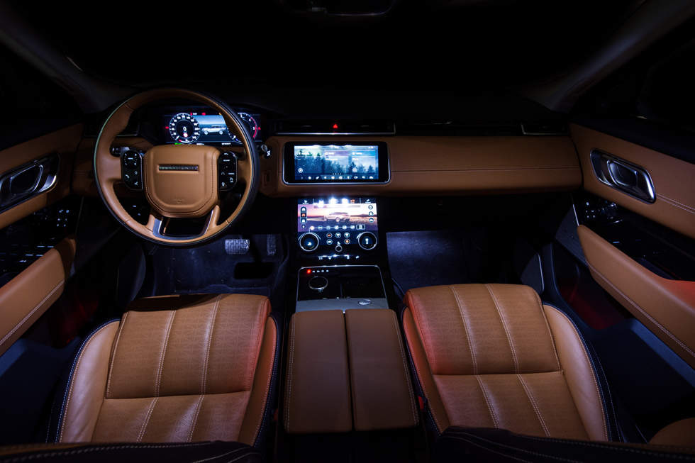 Zcela nové pojetí kabiny také promlouvá o nových přístupech. Pro začátek, úplně zde chybí tlačítka a klasické přístroje. Opět jak vystřižené z nikdy nevyrobeného konceptu. Všechny Velary mají nový displej na středové konzole, jehož prostřednictvím ovládáte klimatizaci, vyhřívání, větrání a masážní funkce sedadel i systém Terrain Response. Zní to komplikovaně, ovšem celek je promyšlený a funguje opravdu dobře. Otočné ovladače mění svou funkci podle potřeby a ty nejčastěji používané můžete ovládat jen točením a stiskem. Díky přítomnosti výklopného displeje, sloužícího jako primární rozhraní infotainmentu, budete mít přehled opravdu o všem, co potřebujete vědět, navíc si můžete všechno nakonfigurovat dle libosti. Nedostatky nalezneme dva. Tím výraznějším je nutnost zvýšené pozornosti při obsluze virtuálních tlačítek, neboť je systém zcela prost jakékoli haptické odezvy (to asi napraví nový velký Range Rover), tím druhým je samozřejmě přirozená vlastnost lesklých povrchů, které ochotně snímají otisky vašich prstů. Nebojte se nic, s Velarem dostanete mimo jiné i speciální hadřík na displeje.