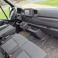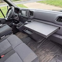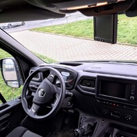 S výbavou se u testovaného kousku zkrátka nešetřilo, pohled do konfigurátoru ukazuje, že až na libůstky typu žebříček na zadních dveřích a pochozí zahrádka tu mám k dispozici veškerý dostupný luxus. To je znatelné hlavně v interiéru, kde mě houpe sedačka na měchu, mám k dispozici Android auto a u spolujezdce mi udělal radost velký vyjížděcí stolek a stojan na kelímek jako stvořený k občerstvovacím zastávkám. Kabina je posetá množstvím odkladacích schránek a poliček, jak to má ve velké dodávce být. Manévrování pak usnadňuje dvojice kamer vzadu – jedna klasická couvací u poznávací značky a ta druhá, umístěná nad zadními dveřmi, tu s pomocí displeje supluje prostřední zpětné zrcátko. Tohle řešení mi moc vyhovovalo i u o poznání menšího Kangoo a pochvalu si zaslouží i zde.
