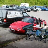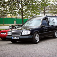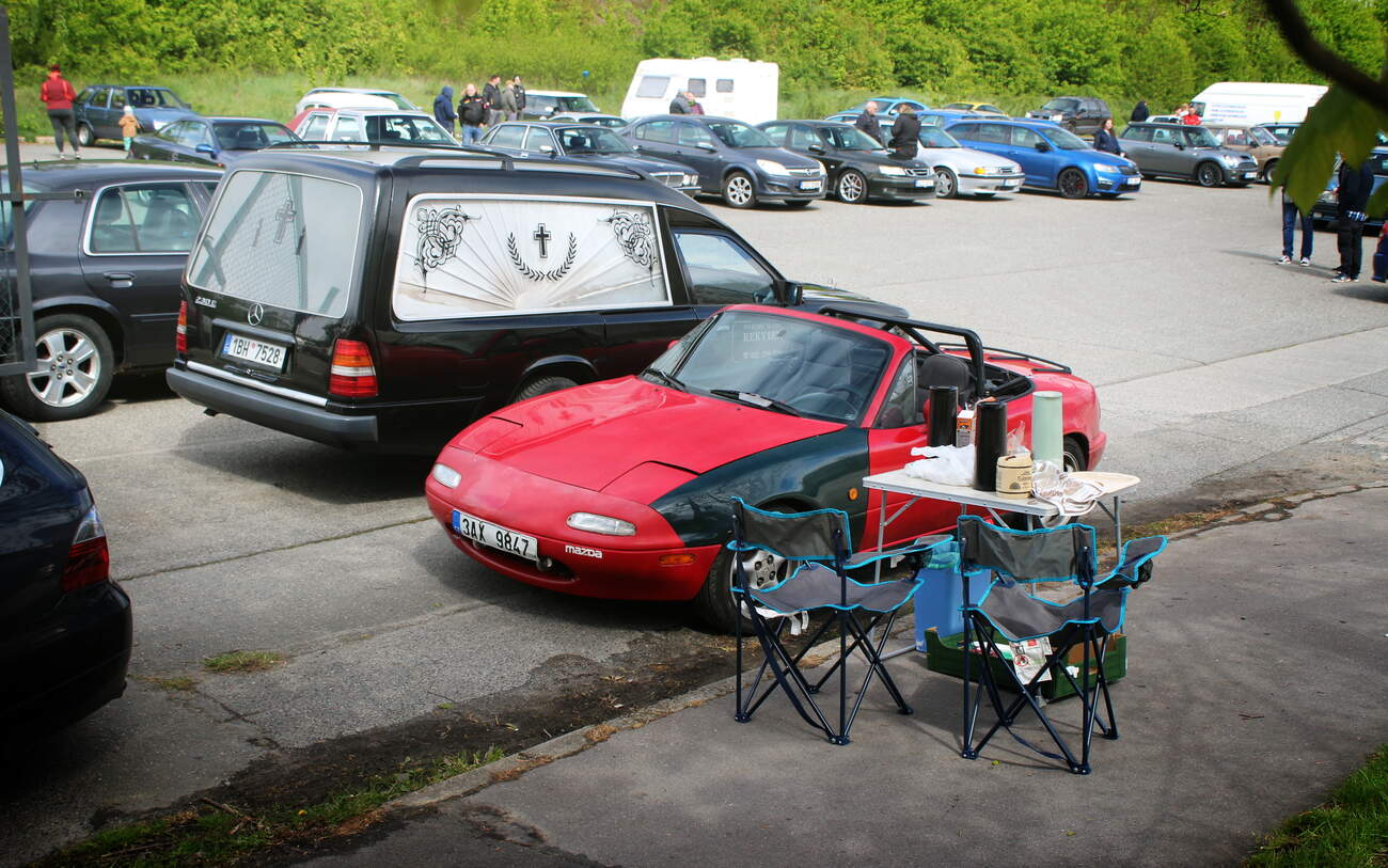 Jako jedna z prvních věcí, která poutá moji pozornost, se tak stává pohřební vůz značky Mercedes-Benz. Legendární model W124, poslední taxík, který budete potřebovat. Už mě to napadlo dřív, jak se vlastně nakládá s pohřebními vozy, kterým skončí služba. Už několikrát jsem slyšel historky o tom, jak by se daly skvěle předělat na kemping. Což sice technicky dává smysl, ale lidsky je to… prostě trochu divný. Jenže co s nimi, nájezd je často minimální, vždyť by byla škoda je prostě sešrotovat. Každopádně ve srazových sférách se jedná o zajímavou kuriozitu.