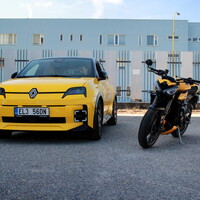…ani my jsme však nezůstali pozadu. Takže Jarda přijel s testovaným Renault 5 a David se zástupcem motocyklové sekce, Trumph Street Triple 765 RS .