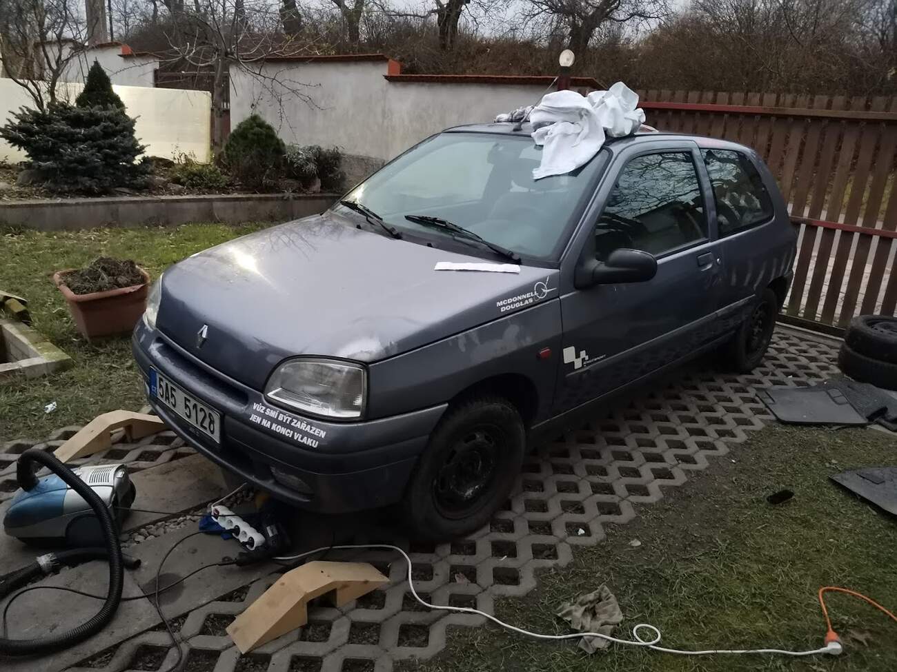 Koupil jsem klíště za pětku. Funguje mu klima, není rezaté a vlastně mu není co vyčíst. Navíc jsem se díky tomu seznámil s jeho bývalým majitelem, panem Černým, který kdysi, když jsem ještě ani nebyl na světě, psal pro Svět Motorů. Taková setkání mám moc rád. Clio jsem umyl, olepil blbostma a dal Jeníkovi ke čtyřicetinám. A co bylo dál…No on se vám tu asi přizná, floutek jeden nevycválanej.