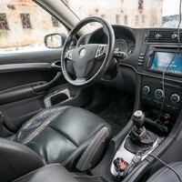 Tento černý kousek má také poměrně slušnou výbavu. Natáčecí bixenonové světlomety, dvouzónovou klimatizaci, vyhřívaná sedadla, automatické stěrače, tempomat, multimediální systém s připojením na telefon nebo extra složitý držák nápojů. Samozřejmostí jsou pak dvě zajímavosti, které k Saabům neodmyslitelné patří – startování klíčem na středovém panelu za řadicí pákou a nighpanel, který vypne nedůležité budíky a nechá svítit především rychlost. Tím nemyslím jen podsvícení, budíky se prostě vypnou komplet a všechny tři ručičky (kromě toho rychloměru) spadnou na nulu. Vypne se i panel rádia a intenzita podsvícení klimatizace a tlačítek na volantu se sníží na minimum. Tohle jistě potěší dálniční jezdce, kteří cestují v noci, a nechápu, proč tuto funkci další automobilky nepřevzaly. Celkově mi ale atmosféra na palubě velmi připomíná moje Volvo, což asi není zas takové překvapení, protože filozofie automobilek si je velmi podobná.