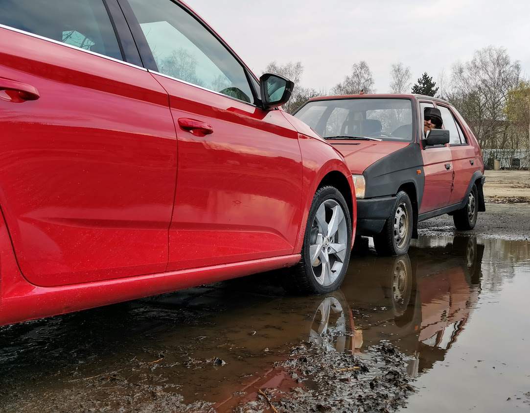 Poslední odstavec pak věnuji podvozku. Ten je u Scaly trochu uskákaný, ale jinak celkem jistý a vlastně jsem o něm většinu času nevěděl. Dokonce ani příplatková větší kola mě tu netrápila a nepřišlo mi, že by nějak zásadně ovlivnila jízdní komfort. Podvozek Favoritu je typický svojí rozkolíbaností, na limitu je ale čitelný a vlastně si nechá líbit docela dost. Krizové manévry, jako například Losí test, nebo prudší brždění v zatáčce ale samozřejmě zvládá o světelné roky lépe Scala, kde tyto eskapády většinou lze zvládnout bez problému. Když jsem si ale v rámci objektivity zkoušel rozhodit v zatáčce Favorit, byl z toho málem hnědý poplach. Na záludnost jednoduché odlehčené zadní nápravy a léty ztvrdlých zimních pneumatik se dá za pár let pozoruhodně pozapomenout.