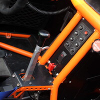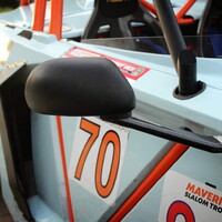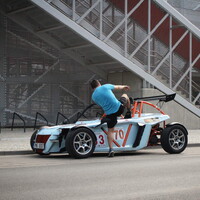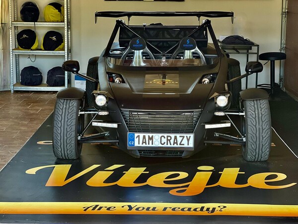 K usnadnění nástupu lze nejprve sundat rychloupínací volant. Při mých kompaktních rozměrech a s trochou obratnosti však lze nastupovat i s kormidlem na místě. Karbonové skořepiny s pouze několika milimetry pěnového polstrování, drží pevně na místě, k dosažení ideální řidičské pozice slouží posuv pedálovky. (motokára!) Její nastavení je však docela výzva. Je potřeba sundat kapotu, odšroubovat pedály, posunout, letmo přichytit, vlézt dovnitř, vyzkoušet. Pokud jste spokojeni, stačí složit. V opačném případě vás čeká opakování nástupu, výstupu, šroubování a posouvání ještě několikrát. Zkrátka primárně se jedná o vůz pro jednoho řidiče, maximálně pro přibližně stejně vysoké kolegy. Naštěstí se už pracuje na zlepšováku, pedály dostanou kolejnice a bude s nimi možné hýbat táhlem i z pozice řidiče. Před sebou máte volant, malý displeji s informacemi a uprostřed pár tlačítek ovládajících základní funkce – startování, světla, klakson. Infotainment ani rádio zde nenajdete. Stejně byste ho v helmě neslyšeli. Jistě, je možné jezdit i bez helmy, ale rozhodně ji vřele doporučuji. Zkoušel jsem pouze sluneční brýle a s nimi zvládnete spíš jen průjezd městem. Já se přitom ještě můžu přikrčit a schovat za imitaci čelního skla, ostatní to budou mít těžší a větrnější. Jezděte s helmou, vyplatí se to, i kdyby jen kvůli hmyzu rozplácnutému ve vašem úsměvu.