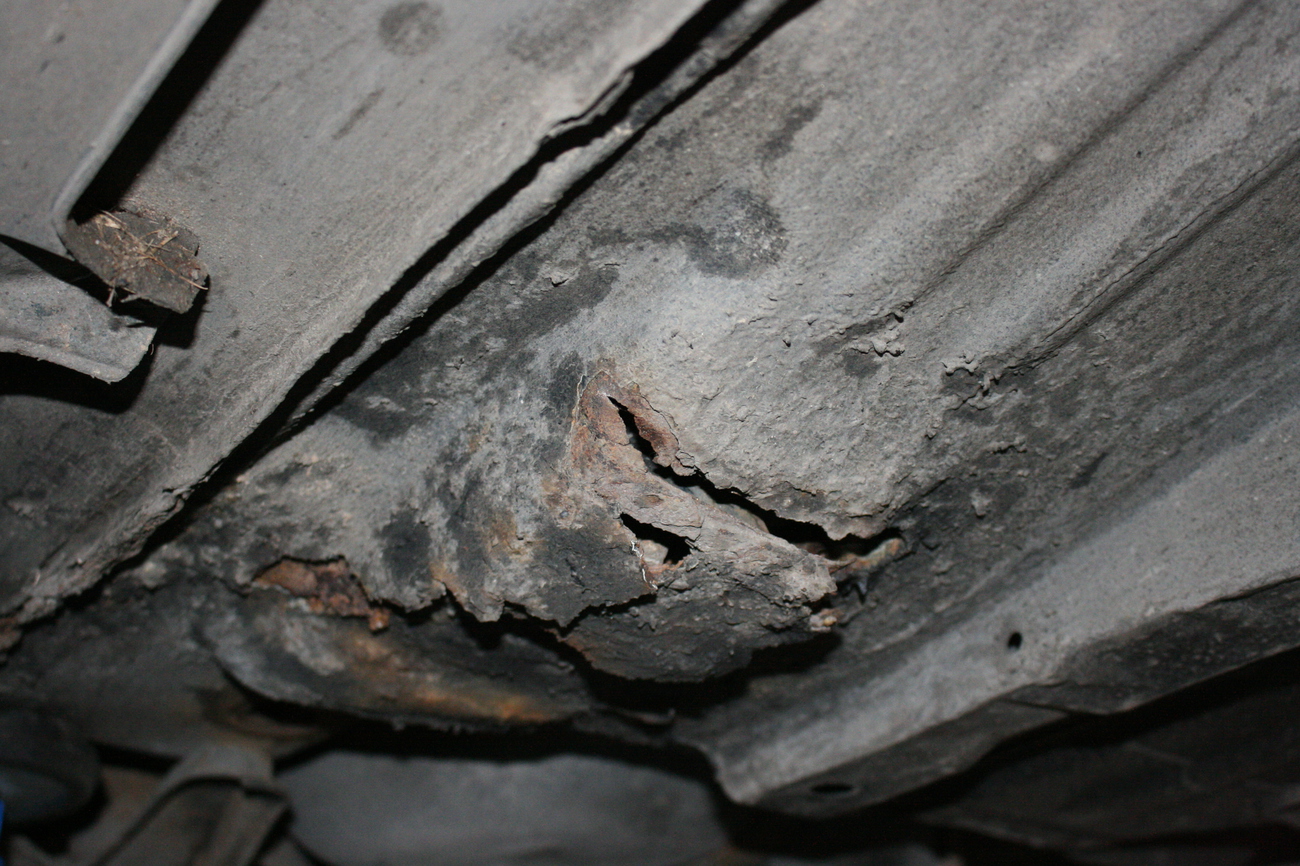 Na první pohled ale všechno vypadá vcelku dobře. S vylomeným krytem pod motorem jsem počítal, trochu mastnoty tu a tam lze přičíst sebekonzervačním schopnostem dvacet let starého auta, všechny podvozkové komponenty jsou na pohled i pohmat v naprostém pořádku…a ta díra v podlaze tam dělá jako co?! Když už jsem se skoro radoval, že se první zvednutí obejde bez nepříjemných zjištění, odhaluji prorezlou díru v místě uchycení spolujezdcova sedadla. O to paradoxnější je, že všechna ostatní místa jsou s výjimkou minimální povrchové rzi naprosto zdravá. Jen tudy si během let příroda našla cestu skrz. No co, zavaří se, mohlo být i hůř.