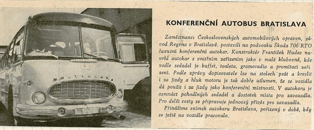 Snad prý z jakési podnikové rivality, i když to dnes již nikdo nepotvrdí, ani nevyvrátí, si výrobu speciálně upraveného autobusu, tentokráte na základě starší (ale jak jsem již konstatoval, velmi podobné) Škody 706 RO, prosadily také Československé automobilové opravny, závod Regena Bratislava. Šéfkonstruktérem tohoto jedinečného vozu se stal inženýr František Hudec a společně s kolegy v šibeničním termínu osmi měsíců vytvořil vůz, jež nejen, že se Diblíkovu Expu vyrovnal, ale troufnu si říci, že ho i překonal.