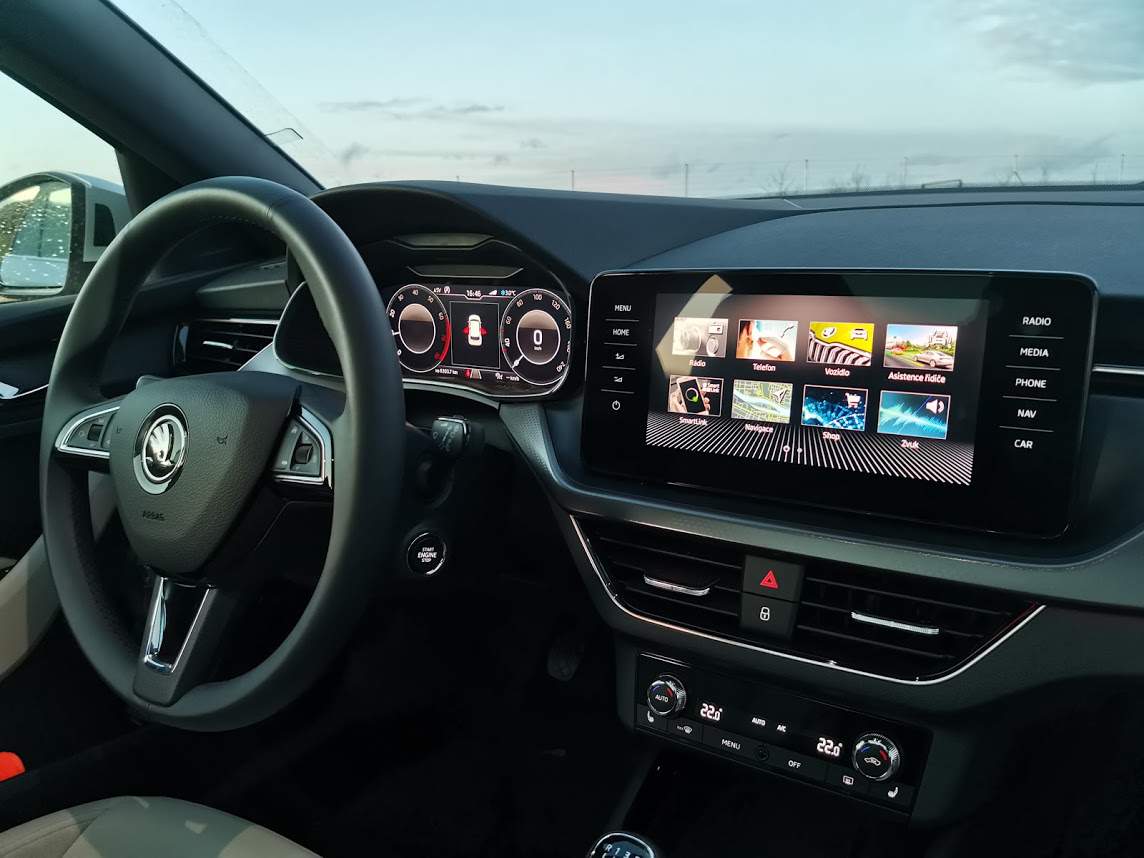Kamiq je vybaven podobnou kombinací ovladacích prvků, infotainmentu a digitálního přístrojového štítu, jako menší Scala. A bohužel se tu opakují stejné problémy, na které si na podzim stěžovali v testech František a Dan. Systém je pomalý, neodladěný, často zamrzá, objevují se hlášky o nefunkčních systémech (typicky parkovací kamera, která ale na pozadí hlášky normálně funguje). Během testovacího týdne mi vůz nabídl aktualizaci, kterou jsem musel spouštět natřikrát, protože první dva pokusy skončily tvrdým restartem systému. A i přes dvě hodiny upřímné snahy se mi nepodařilo se do auta přihlásit se svým vlastním vytvořeným Škoda účtem. Po zadání loginu a hesla se celý přihlašovací proces prostě spustil znovu, nepomohlo ani založení jiného účtu, ani restarty, ani pročítání internetových fór, kde se problémy s infotainmentem řeší až nepříjemně často. Bohužel nešlo ani smazat nastavení předchozího majitele auta, po spuštění navigace jsem tedy musel pravidelně odmítat cestu “domů”, protože to bylo kdesi v Měchenicích.