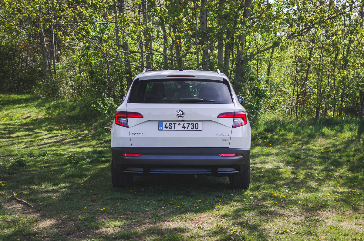 Sáhodlouhé popisování exteriéru není úplně na místě. Všichni jsme Karoq určitě někdy viděli. Je to něco jako Kodiaq, ale menší. A levnější. Nejspíš nejvíc je to vidět na zadních světlech, která má Kodiaq větší. Karoq je ale má takové… zdrclé? Zadání designérovi bylo jasné, udělat menší a laciněji vypadající. Povedlo se, vypadá to tak. Jinak ale není moc co vytknout. Ani v čisté bílé Karoq neurazí, nicméně moji maličkost ani nenadchne.