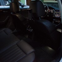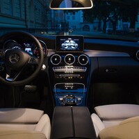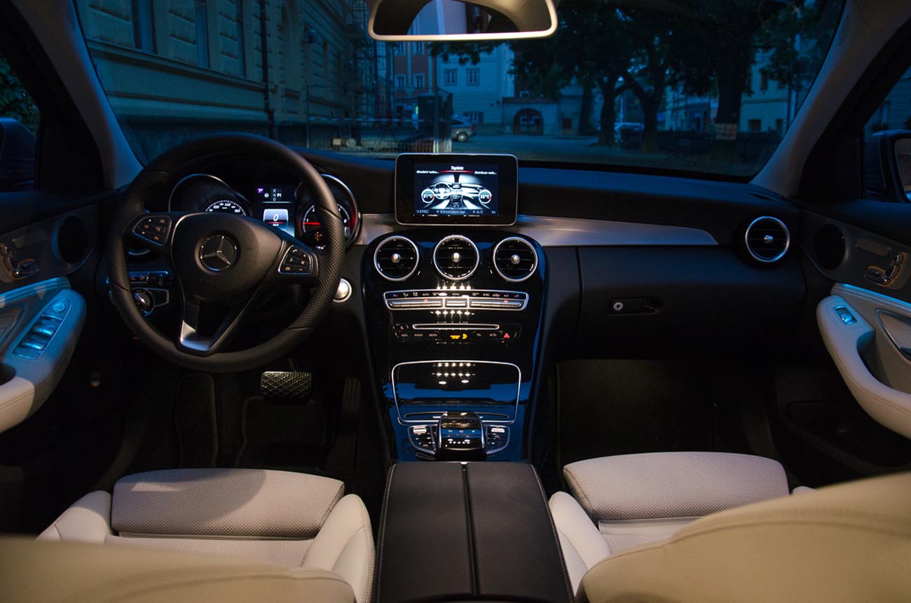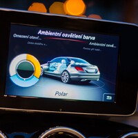 Když dva dělají totéž, nevede to vždy ke shodnému výsledku. Superb i Céčko přijely s příplatkovou položkou s názvem ‚ambientní osvětlení‘. V mercedesu funguje na principu skrytého zdroje světla pod lištami, jímž se osvětluje palubní deska, dveřní výplně, středový tunel atd. Samotný zdroj světla nevidíte, zkrátka máte vůz osvětlený zvoleným tónem. Barevně si můžete vybrat ze tří možností, které se jmenují Solar, Neutral a Polar a jsou zbarvené do oranžova, teplejšího odstínu bílé a světle modrého tónu hluboce zmraženého ledu. Všechny tři možnosti vypadají hezky, můžete si navolit intenzitu svícení a na celku je vidět, že si s ním někdo dal práci. Je to povinný prvek ze seznamu příplatkové výbavy, dojem z interiéru je díky němu o dost luxusnější. Superb má také tři možnosti nastavení, ale tím podobnost končí. Škodováci použili viditelné, přiznané pásky, které se rozsvítí do jedné ze zvolených barev. Když do Superbu přesednete z Fabie, asi vás to ohromí, ale když víte, co nabízejí jinde, je to slabší. Ještě horší jsou barvy. Možnosti ve Škodovce se jmenují Modrá, Zelená a Teplá bílá. Vymyslet názvy dalo určitě spoustu práce. Volba Modrá připomíná podsvícení ve VW Golf čtvrté generace, jen ještě o malinko tmavší, a vypadá to strašně. Zelená je v barvě škodováckého loga. Když přihlédnete k barvě značky, dá se to pochopit, byť to není ani hezké, ani ošklivé, taková barva chytré horákyně. Asi nejhezčí z možností je Teplá bílá, ta však na viditelném pásku moc luxusně nevypadá. Mercedes zde nehraje jen jinou ligu, ale jiný, mnohem sofistikovanější sport. Rozdíl se projevuje i v úplných detailech, jako je barva standardního osvětlení interiéru, která je u mercedesu příjemná, měkká a lichotivá k lidským tvářím, kdežto Superb svítí jako lampa kosmetičky, dermatologa nebo rovnou patologa. Existuje fyzikálně popsatelný důvod, proč v mercedesu vypadáte lépe než ve škodovce. Samozřejmě je to bod pro mercedes.