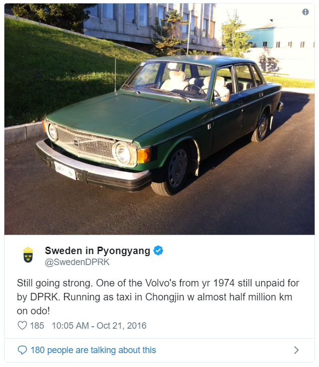 Situace v Koreji není nepodobná té na Kubě. Auta jsou tu dosud velmi cenná a i poměrně zastaralé a historické vozy se jejich majitelé snaží udržovat v provozuschopném stavu. Volva 144 ve službách taxikářů tak korzují po místních silnicích dodnes. Konec konců, i fotografie použité ve článku jsou všechny z poslední dekády. Na rozdíl od rozpadlých důlních strojů jsou tak dodnes žijící připomínkou jednoho nesplaceného dluhu. Od sedmdesátých let se politická situace přeci jen změnila. Švédové už nejsou jediným národem, jež udržuje s Koreou diplomatické vztahy a význam jejich velvyslanectví už mírně klesl. Na starý dluh ale nezapomněli a dokonce na něj nedávno upozornili na Twitteru.