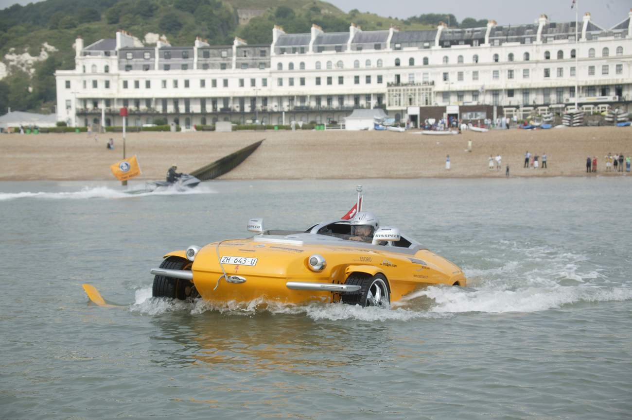 No dobrá, odolám pokušení ukončit dnešní výběr sovětskou šíleností a raději napnu vaši pozornost do Švýcarska. Země, která k autům chová velmi schizofrenní vztah, je totiž domovem dílny Rinspeed. Určitě jste již některý z jejich šílených konceptů viděli a s vodou jsou spřízněni hned dva. První se jmenuje Splash (Cákanec) a představil se na Ženevském autosalonu v roce 2004. Roadster s pohonem zadní nápravy ukrývá ve své odklápěcí zádi konvenční lodí šroub, poháněný mechanickým převodem od motoru. Na vodní hladině pak plavbou dokáže dosáhnout až 50 km/h, což je rychlost dostatečná pro vodní lyžování.