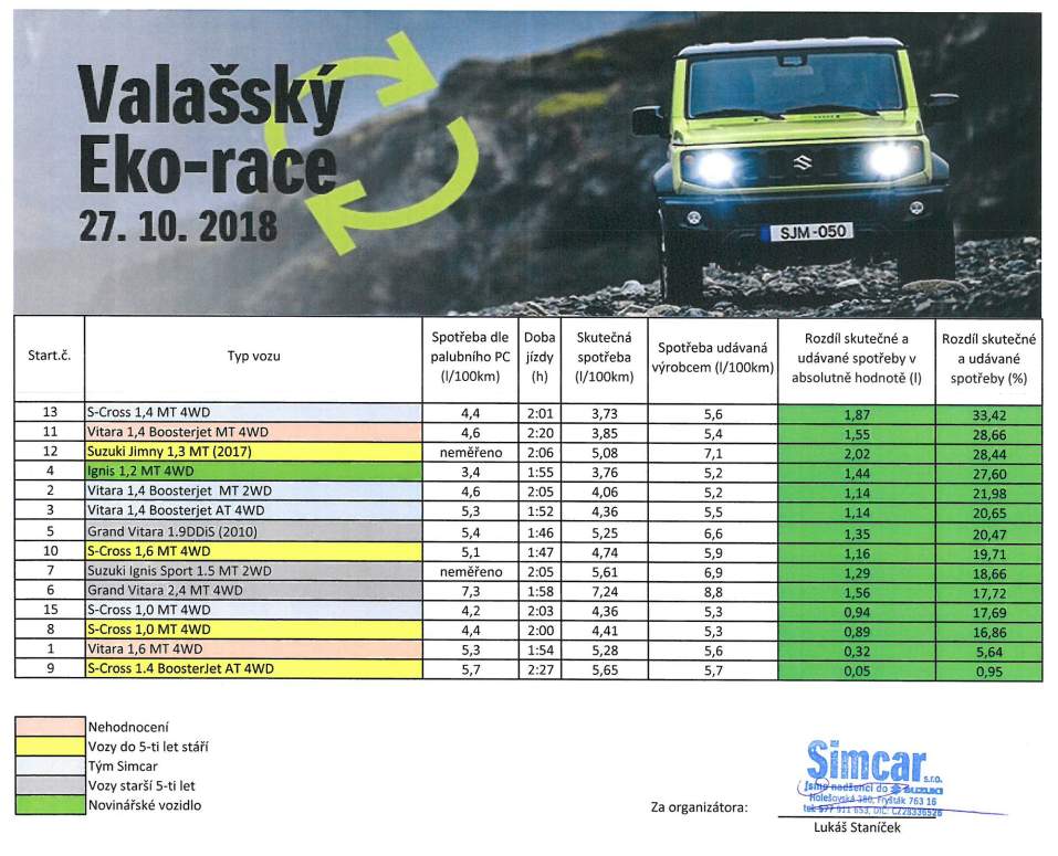 Jak celý podnik shrnout? Zaprvé jsem rád, že jsem byl pozván a pracovníkům fryštáckého dealerství Suzuki Simcar děkuji za organizaci celé akce. I přesto, že se jednalo o první pokus, celá akce byla hezky vymyšlená, organizovaná a velmi zábavná. Trasa závodu nás provedla krásnou krajinou Zlínska a Vsetínska, vzájemná soutěživost mezi týmy nenarušovala přátelskou atmosféru celého podniku a všechno se odehrávalo ve velice příjemné náladě. Ani to ošklivé počasí neškodilo. Nikdy jsem si nemyslel, že by mě mohla bavit jízda na spotřebu, ale nakonec jsme se i s navigátorem pobavili opravdu dobře. Od té doby přemýšlíme, že se přihlásíme i na další podobný podnik. Pokud se tak stane, určitě vám podám zprávu.