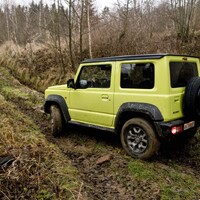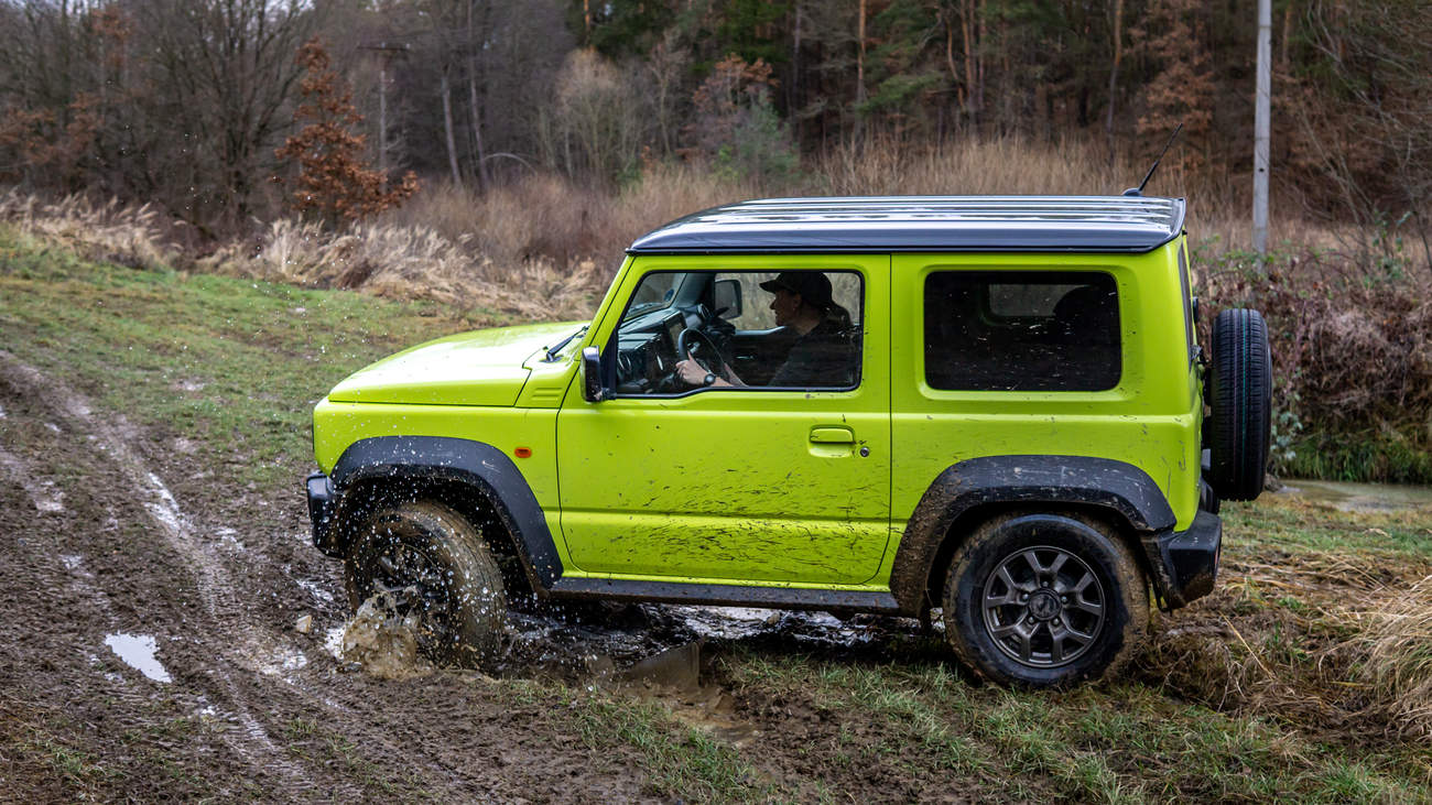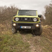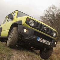 A pak se ocitnete na podmáčené louce. Směrem do kopce. Na silničních gumách bez čudlíků. A auto jede. Na čtyřkolku tak nějak furt poskakuje jako na pražské dlažbě, točí motorkem a stoupá. A pak vám ta milá paní, co umí zapadnout směrem z kopce, řekne; “Hele, tady to jde dolů”. Přede mnou se rozprostírá něco mezi bobovou dráhou a střechou hotelu Pyramida. Pustím se pomalu dolů, dobržďuji motorem, sunu se do strany, pak se sunu nekontrolovaně, pak se bojím a pak jsem dole. Hm. Jako jo, ale po kolejích umí jezdit i vlak. Šok přišel, až když jsem pak velmi podobnou směsici vertikál na těch silničních gumách vyjel i nahoru. Skutečně jsem měl pocit, že mám odhad na to, co jde zvládnout. Ostatně v ostrém mokrém terému jsem už v životě strávil minimálně čtyři hodiny! Jimny mě ale přesvědčil, že jsou auta a auta. Budete mi asi muset věřit, nebo mě mít za nezkušeného blba, ale to, co ta malá reflexní krabička vyhopsala v mazlavém blátě, je skoro nepředstavitelné. Daní za prostupnost je však uskákaný podvozek, který fakt nemá rád rychlou jízdu rozbitým terénem a je vhodný pro ono rozvážné posunování se nebo pak také tydlencty konpromisy ve městě.