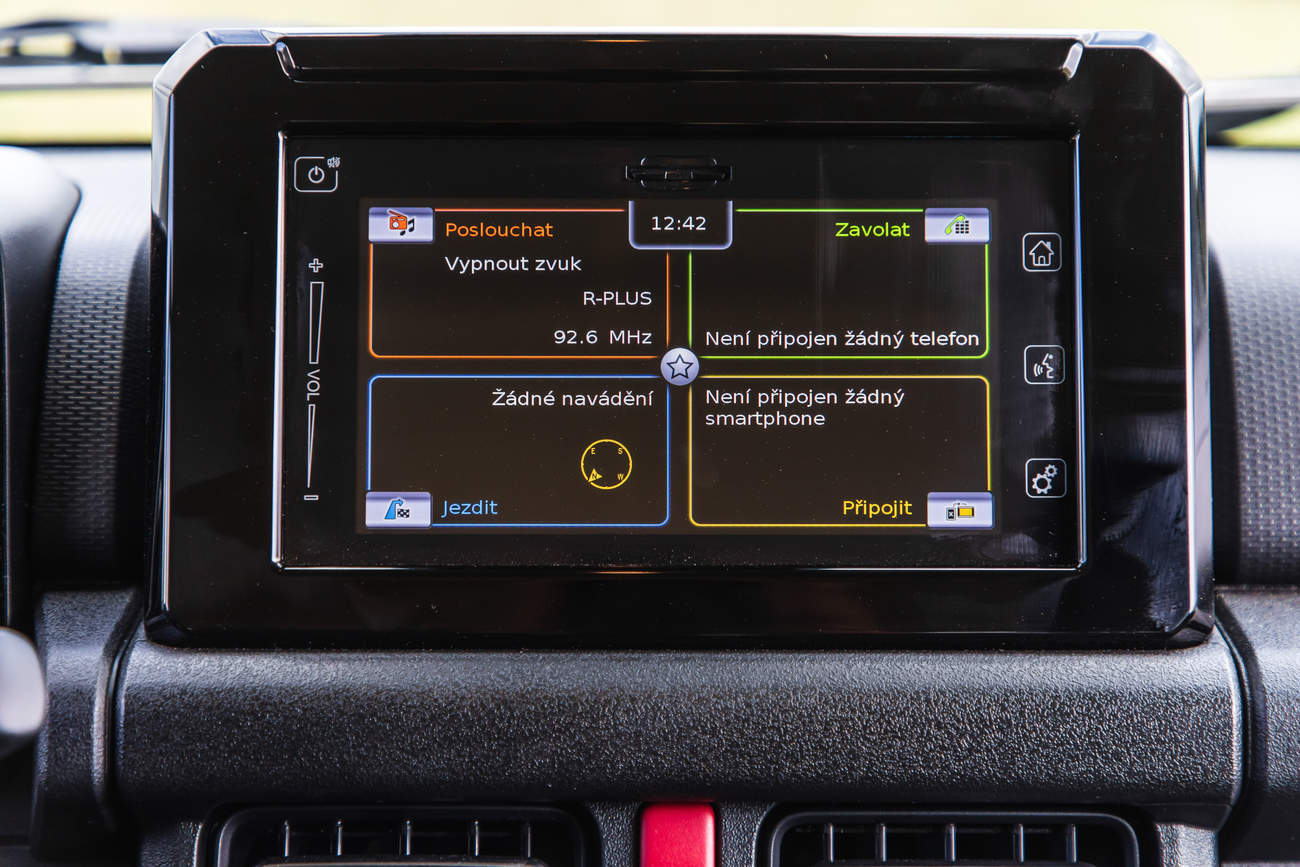 Jako správné moderní auto má Jimny radiomapu, i ta je jednoduchá a účelná. Nemá žádné speciální funkce, jen audio, navigaci a telefonování, všechno přehledné a dobře ovladatelné. Komu by se to nelíbilo, pořád má k dispozici Android Auto a Apple Carplay, nic víc opravdu nepotřebujete. Vlastně ano – potřebujete jinou reprosoustavu, tahle je opravdu za trest.