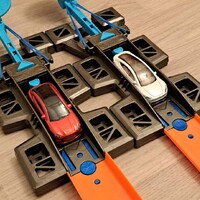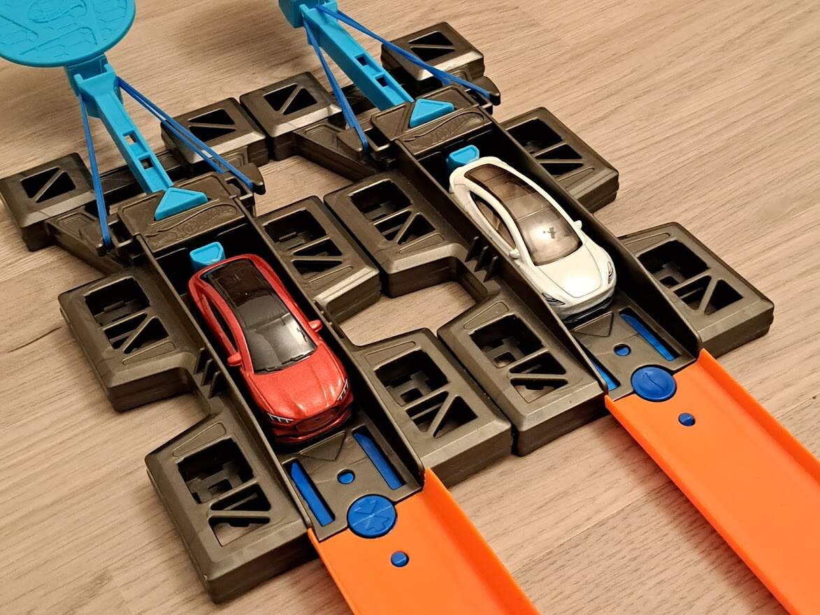 Závěrem jsem se rozhodl postavit americké elektromobily proti sobě v typické americké disciplíně. Sprint na čtyři dílce klasické Hot Wheels dráhy. Cílová čára byla vyznačena modře. Jistě chápete, že k tomuto exaktnímu testování jsem přistoupil skutečně zodpovědně a snažil se co nejvíce eliminovat vnější vlivy. Což vzhledem k tomu, že závod probíhal uvnitř nebylo zas tak těžké.