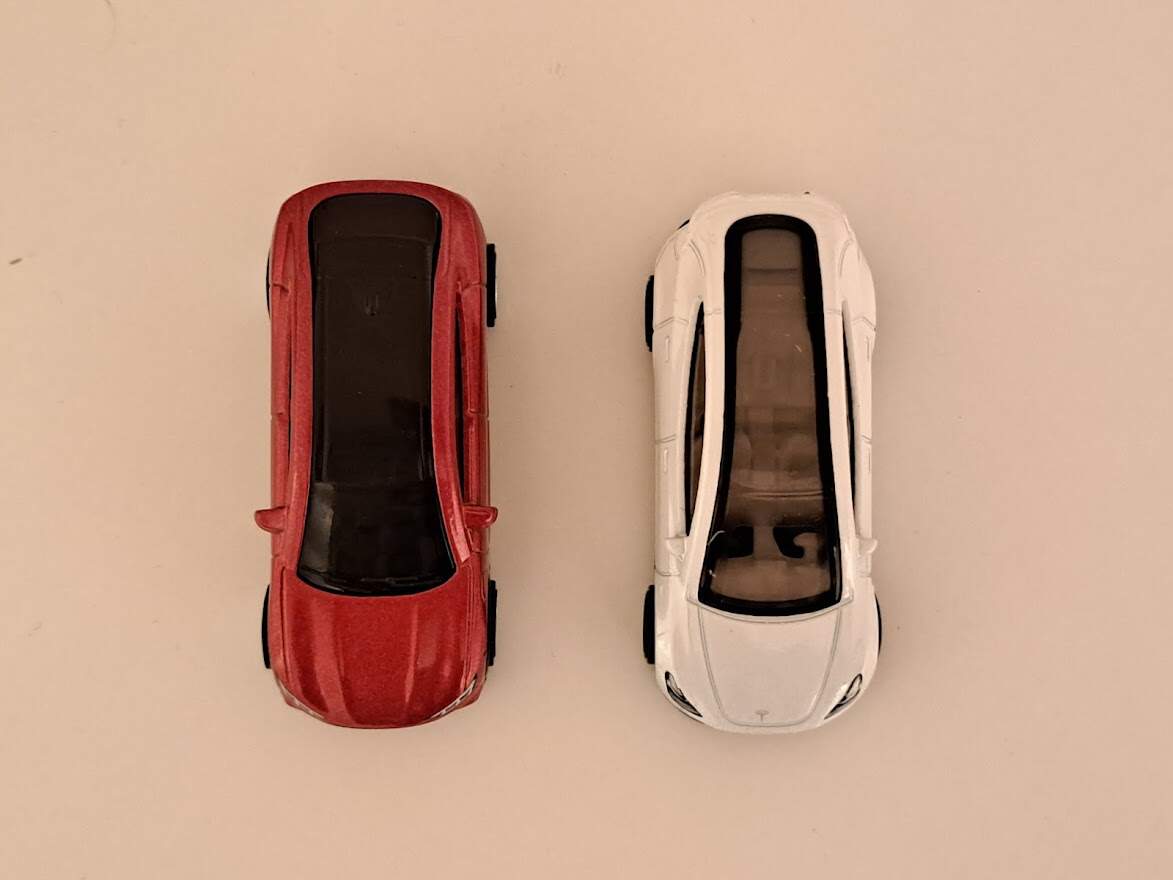 Tesla je typický “obchoďákový” Hot Wheels. Pořád jde za ty peníze o vcelku pěkně zpracované autíčko, ale hlavně nepřesnost tisků a nízká váha odhalují, že i u věhlasné značky se zkrátka musí šetřit. Potěšilo mě, že oba vozy drží rovnou stopu, nešmajdají a nemají tendenci se točit k jedné straně. Nevšiml jsem si ani žádné ovality koleček nebo otřepů, které zabraňují volnému otáčení.