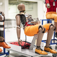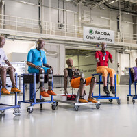 Do Úhelnice nastoupil Thor 50M v roce 2019 a rozšířil tak už celkem početnou rodinu starších figurín typu Hybrid III. Pokud vás zajímá, co se skrývá pod označením 50M, jde o zkratku pro ‚50% muž‘. „To znamená, že jeho velikost a hmotnost pokrývá zhruba padesát procent mužské populace,” vysvětlil nám Jan Domkář, jeden z vedoucích pracovníků vývoje bezpečnosti vozu ve Škoda Auto. Vedle na vozíku sedí například 95% muž nebo 5% žena, oba typu Hybrid III. Jejich úkol je jednoduchý – poskytnout co nejpřesnější informace o tom, jak extrémní změny v kinetické energii působí na lidské tělo v reálném světě.