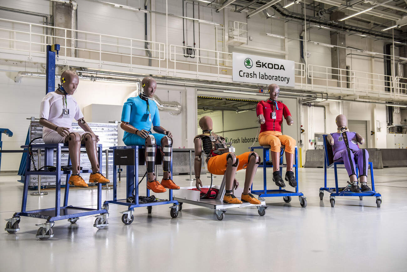Seznamte se s Thorem (na obrázku dole uprostřed), chlapíkem, pro kterého není žádná bouračka dost drtivá. Jeho jméno samozřejmě v první řadě znamená, že jde o pěkně drsného týpka, a pak je to taky zkratka pro Test device for Human Occupant Restraint. Thor je doma v testovací centrum Škody v Úhelnici poblíž Mladé Boleslavi a jeho úkolem je představovat průměrného muže v simulovaných dopravních nehodách všeho druhu, ať už jde o čelní náraz, boční náraz nebo třeba náraz do sloupu. Za svou práci si nechá celkem slušně zaplatit – jeho služby si sice automobilka kupuje doživotně, ale vysází za ně půl milionu eur, tedy nějakých dvanáct milionů korun. Bez daně. ‚Doživotně‘ pak znamená v průměru na deset let, po nichž se figurína odebírá do důchodu.