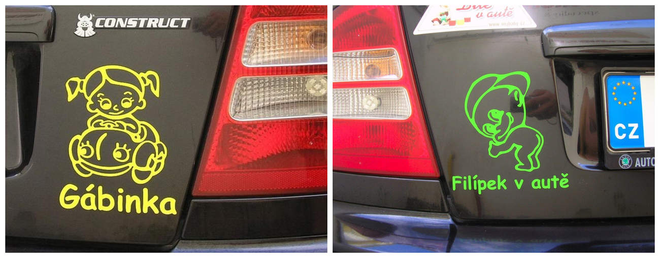 Snad to nejhorší, co může nebohý vůz potkat je rodič natolik hrdý na to, že v autě vozí své ratolesti, že tuto skutečnost demonstruje nevkusnou samolepkou se jménem dítěte. Už samotná snaha upozorňovat na přítomnost dítěte ve voze je diskutabilní – nejlépe to shrnul neznámý řidič Fordu Mondeo, jež jsem nedávno potkal na D10. Ten měl na zadním nárazníku napsáno “V autě jedou jen dospělí, ale budeme rádi, když do nás ani tak nenabouráte.”