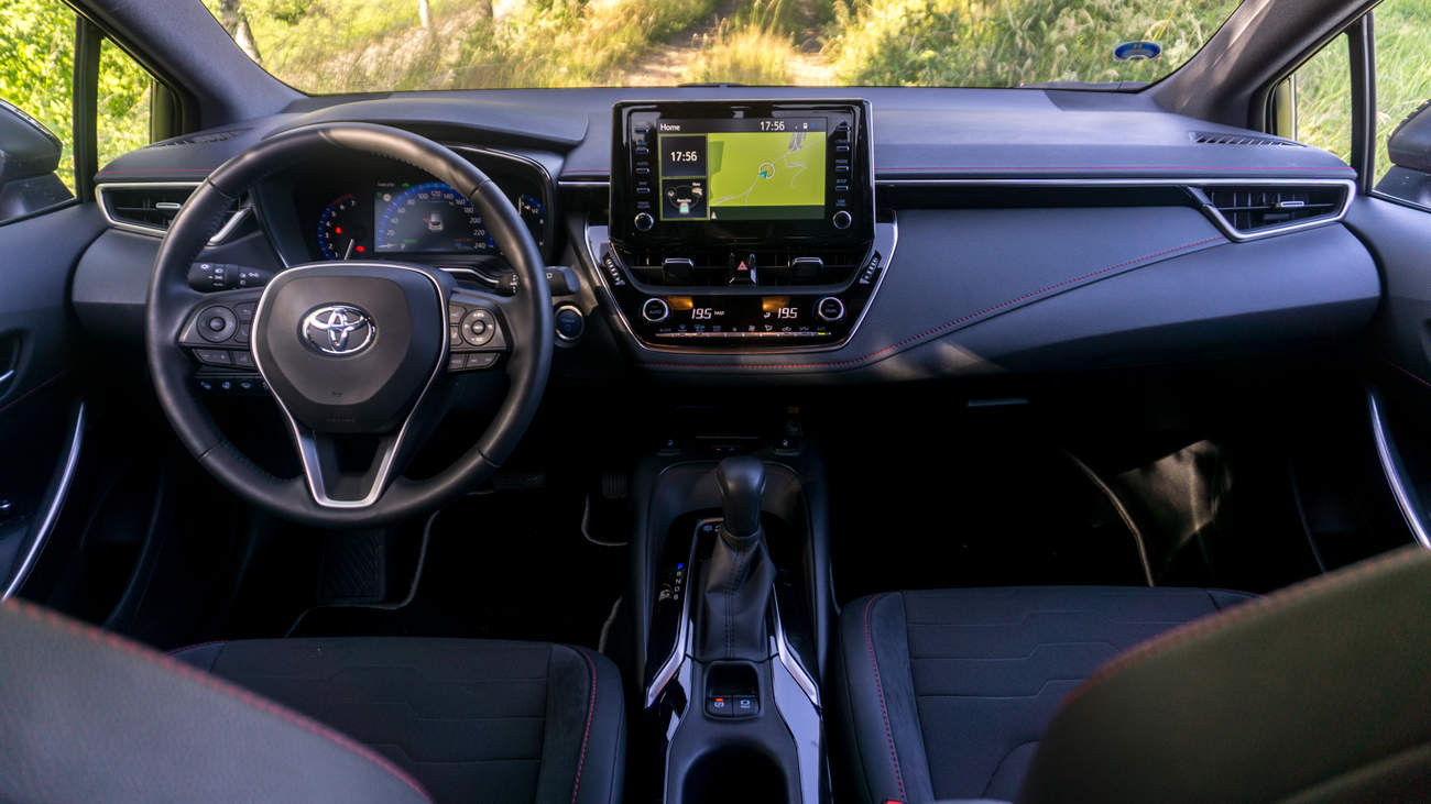 Dobrá barevná kombinace, stejný designový jazyk a příjemnější proporce hatchbacku celý stroj v mých očích zachraňují. A interier se posunul dopředu taky mílovými kroky. Tam, kde bylo vidět v minulé generaci tápání a chaos, teď nastupují hezké detaily, které ovšem drží pohromadě. Docela kulím oči, jak se to povedlo. Pravda, designový kousek u levých dveří, kde prostě jen trčí černá hrouda plastu s "linkou propojující celou palubní desku" vypadá s otevřenými dveřmi komicky, ale… S otevřenými dveřmi byste stejně neměli jezdit. Jednoduše řečeno, celý interier vypadá podstatně lépe a radostněji, sedačky jsou super a dokonce i ta prokletá toyotí navigace dostala nové fyzické čudlíky a trošku zrychlila, takže už se o ní nedá říct, že by byla jen držákem přísavky držáku telefonu. Prej bude brzo nová, tak jsem zvědav. Třeba bude mít i CarPlay. A i ty trošičku pouťové přístroje jsou smysluplné a k autu se hodí. Jen teda podsvětlení se nastavuje až starověce vypadající tyčinkou, jež z budíků trčí. Holt jak jsem psal dříve, Kaizen pořád funguje a některé věci se nemění. Ani prakticky umístěný čudlík lane assistu se neodsunul někde do podmenu, ale je hezky dedikovaný a na volantu.