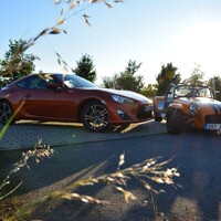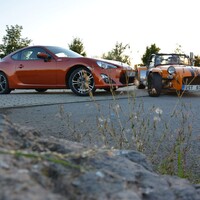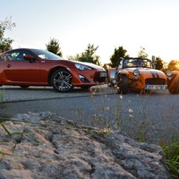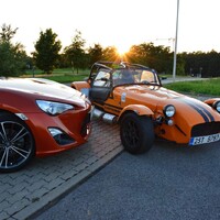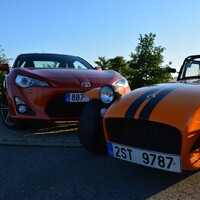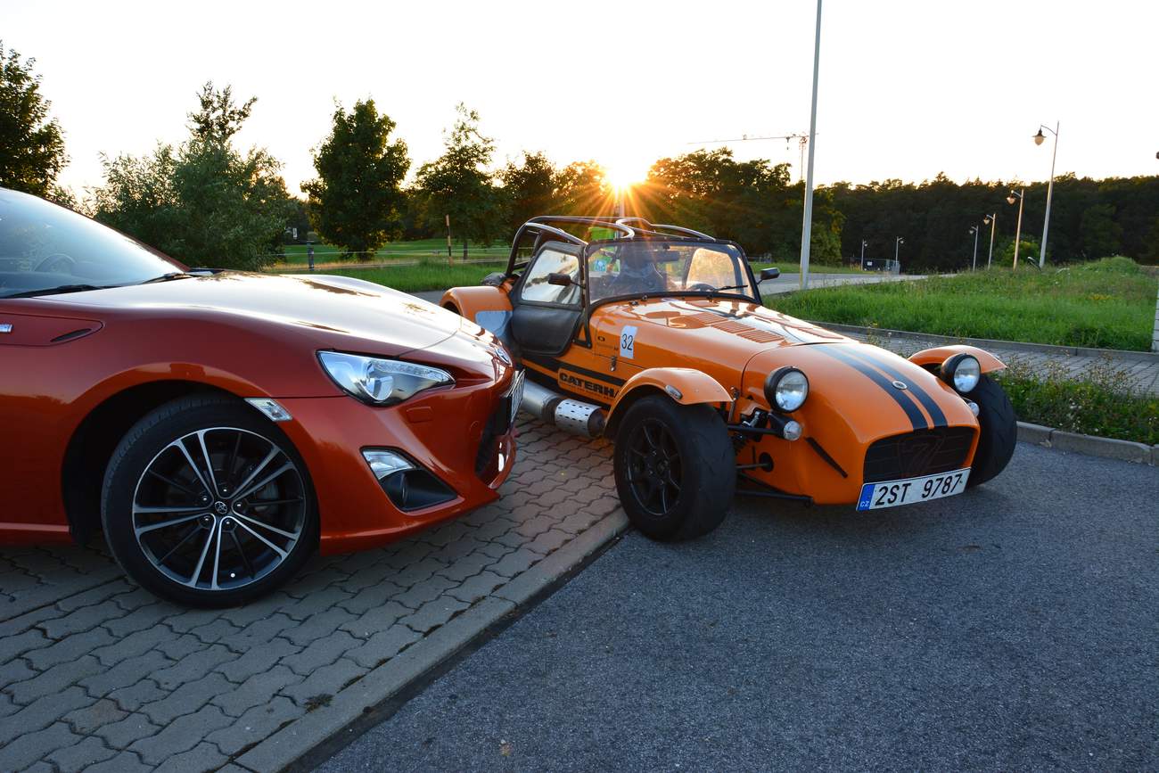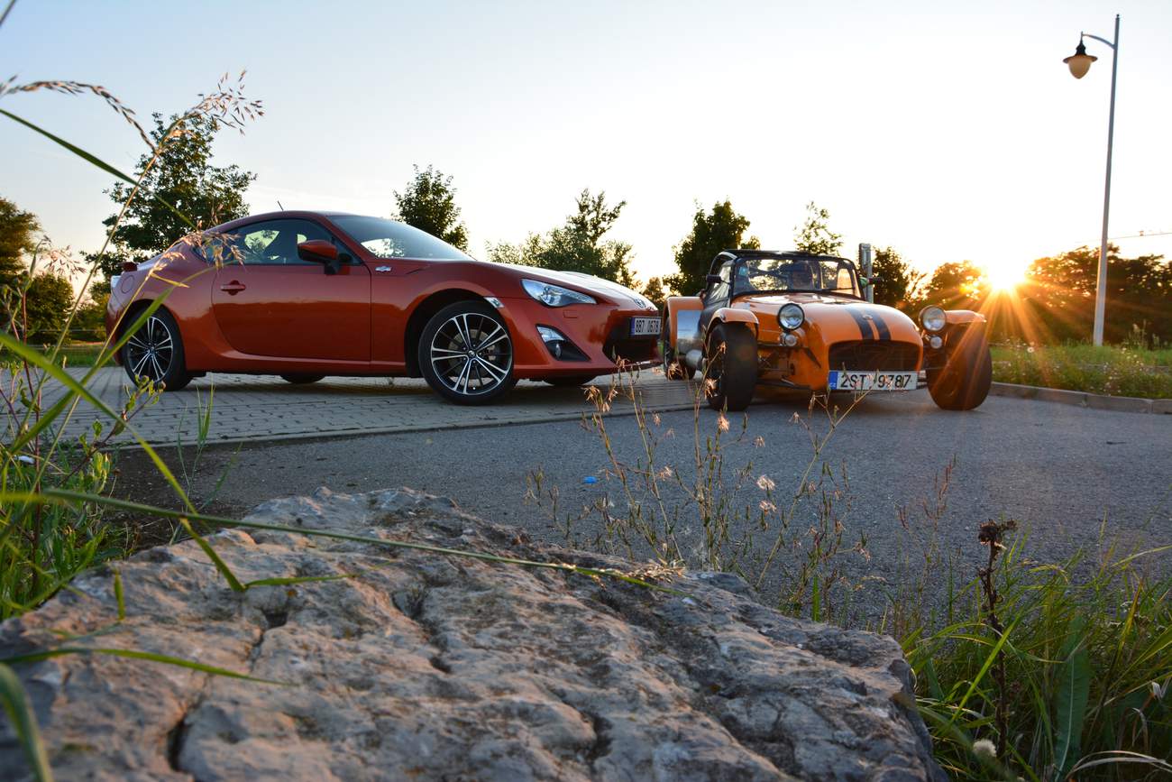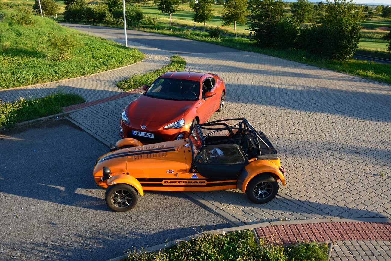 Prostě jedu a auto funguje, podívám se na zatáčku a zatáčím. Já se zkrátka domnívám, že zadní kola mají auto pohánět a ty přední jen zatáčet. Je to jednodušší a přirozenější pohyb a ta další dvě auta výše to demonstrativně dokazují. Jsem už nasoukaný mezi trubkami ochranného rámu Caterhamu a vyjíždím vstříc oblíbené okresce. A Saage jede za mnou v mojí Toyotě. Když se vše zahřeje a Avony nalepují na silnici cokoli sypkého jako obří žvýkačky, když Caterham zatáčí pouhým pohledem a na míjeného cyklistu se dívám prudce nahoru jako by to byl nějaký obr, můj svět se dostává do jiné dimenze. Připadám si jako bych toho Catíka ukradl. A to rovnou na závodní dráze, projel paddockem a nějak omylem se ocitnul na veřejné silnici. Všechno se klepe, v zrcátku není přes vibrace vidět skoro nic a jediné, čeho si všímám, je, že se GT86 vzdaluje na rozvibrovaném horizontu. Bráááp, dvojka, daří se mi podřazení s efektním meziplynem, výfuk se rozeznívá tak jako tomu bylo u starých závodních aut. Lotus je to jediné slovo, které mi probleskuje hlavou. Víte, Colin Chapman věděl, jak na to. A já už vám to psal jednou. Napíšu to znova, tohle se neomrzí. Když máte výkon, jste rychlí na rovinkách, ale když uberete hmotnost, jste potom rychlí všude. A je to pravda. Vystupuji lehce zpocený a všímám si lišáckého úsměvu na Saageho tváři. „Tak co, jak?“ „Boží, sice jsem ti nestačil, vždycky když jsi pořádně roztočil motor Catíka naplno, tak přeci jenom jsem holt zůstal trošku pozadu. Ale to tvoje auto tak krásně padne do ruky. Ale o tom už jsme psali v odstavci nahoře.