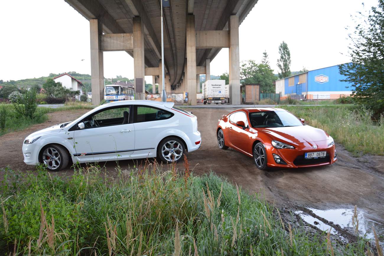 Focus ST kamaráda Briana je jediná předokolka v testu. Má skvěle padnoucí Recara, sportovní volant bez tlačítek, tři od sebe docela dobře rozmístěné pedály a citlivou řadičku. A navíc zní pětiválcovým chraplákem jak od Dartha Vadera. Focusu jsem se věnoval v blogu podrobněji, ale stejně vám to zopakuji. Já vážně pětiválcovou generaci rychlých Fordů můžu. Nakonec - kdo jste četli, bylo vám to jasné. Vyšla na mě řada se s ním svézt a já startuji tlačítkem „Ford Power“ Focuse. Pětiválec a jeho tóny mi hned zvedají náladu a protože máme motory zahřáté, vyrážím na tu naší „touge“ celkem energicky. Vrrrr, uuum, pop, bang, chrrrr, podřazuji na dvojku před první ostřejší zatáčkou, hledám její vrchol a hned co nejdřív přidávám, abych nemusel čekat než se turbo natlakuje. A dějí se zajímavé věci. Fakt, že si připadám, že sedím na lesním posedu, tak nějak dokážu odfiltrovat jako méně podstatný, ale horší to začíná být s citem v řízení. To řízení Focusu ST, které jsem vychválil v samostatné recenzi, je najednou děsně tupé a nepřesné. Celé auto je totiž najednou tak trochu tupé a nepřesné. Kde je ta hravost, kde je ten cit a neutrální chování auta? Rytmus nalézám až ke konci té touge, po pár minutách jízdy, kdy jsem schopen se překalibrovat. Jinak se zkrátka hodnotí auto samostatně a jinak ve společnosti různých soupeřů. Kéž bych býval byl před jízdou vylezl z Rapida pro „petrolheady“. Recenze Focusu by vyzněla v naprostých superlativech. Jenže teď a tady to je zkrátka nejméně lákavé auto na čistě zábavnou jízdu. A to jsem podobné auto skoro dva roky vlastnil také. Hot hatche dokážou být naprosto skvělými auty. A Ford Focus ST nevyjímaje. Na zpáteční cestě si Brian sedl zase do svého auta a já vzal Toyotu a užíval si přesně tu krásnou elasticitu na zádi auta, tu hru s pedály a jemnou motoriku přenosu vah karoserie. Jenom ten bílý Focus ST jako otravná moucha lítal sem a tam v mém zpětném zrcátku a já ne a ne se ho zbavit.