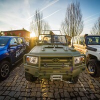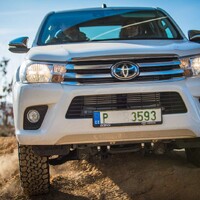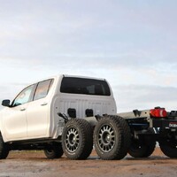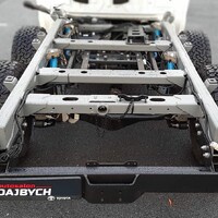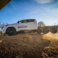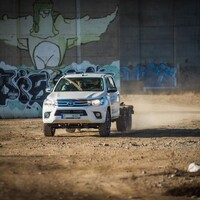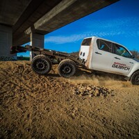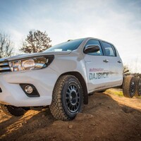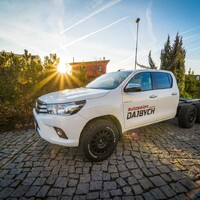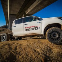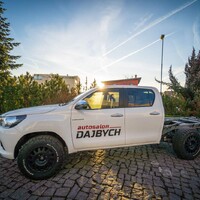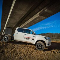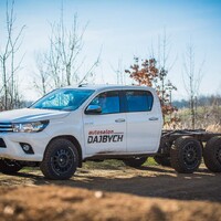 Hlavní hvězdou letošního setkání je Toyota Hilux. Vozidlo není třeba dlouze představovat, už o něm bylo popsáno nesčetně stránek a o jeho důkladné otestování se postaraly celé generace ozbrojených složek, oficiálních i zločineckých. Tenhle Hilux je ale samozřejmě trochu jiný. Na první pohled mu přebývá pár kol a vzadu zase cosi chybí. Jedná se o třínápravovou platformu skýtající velmi široké možnosti nástaveb. Není to poprvé, co se v rukách Dajbychova týmu ocitlo šestikolové auto. Zkušenosti zdejší technici sbírali už před lety, kdy z Dubaje dovezli modifikaci modelu Land Cruiser 70, ten však coby vůz v Evropě oficiálně neprodávaný narážel na spoustu problémů s úředním šimlem. Hilux, tedy vůz určený pro Evropu, se všemi potřebnými homologacemi, se ukazuje jako mnohem vhodnější základ.