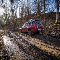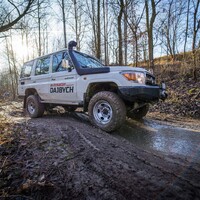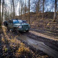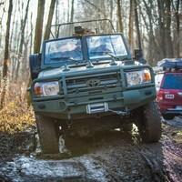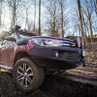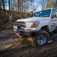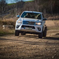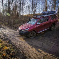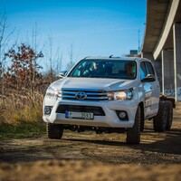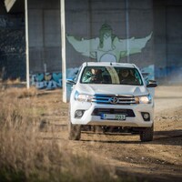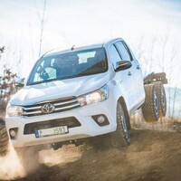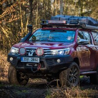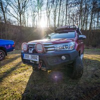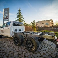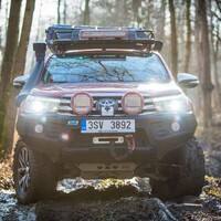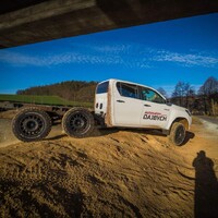 Teorii bychom tedy měli. Dajbychův 4x4 Profi den (dnes vlastně spíš 6x6 Profi den) je ale zajímavý hlavně tím, že si účastníci mohou všechna auta osahat a hlavně projet. Na blízký offroadový polygon se třínápravový Hilux nepodíval z toho prostého důvodu, že již má svého šťastného kupce, a ten by asi nebyl tak šťastný, kdyby mu rozjívení novináři auto odrali o stromy a kamení. Projeli jsme se tedy aspoň po silnici a polní cestě, která zahrnovala i atrakci v podobě velkého terénního schodu. Na to, že je ta věc i bez nástavby dlouhá skoro 6,5 metru, se neřídí o nic krkolomněji než sériový pickup. Jen do zatáčky je třeba počítat s trochu velkorysejším nájezdem, jinak je ale šestikolový Hilux lehce ovladatelný. A že na nerovnostech hopsá jako koza po dvojitém espressu? Představte si na korbě tři tuny zátěže, pak už se ani nehne.