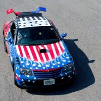 Specifikace: Chrysler Crossfire kupé: Sériové auto s motorem 3,2 V6, 215 koní a 310 Nm. Díky americké vlajce přes celé auto se dá v klidu připočíst dalších sto koní výkonu.