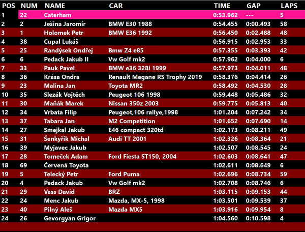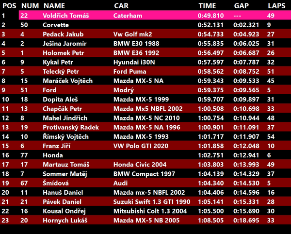 25. 10. 2022, 07:58Časomíra zde. Jen bych rád podotkl, že jsme vyjímečně zvolili variantu včetně dvou šikan nahoře, což znamená 1-2 sekundy na kolo navíc, takže nesrovnávat s jinými termíny TD.