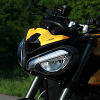Triumph sebral kuráž a opět se vrátil k veselejším barvám, čemuž rozhodně fandím. Namísto nudné bílé, černé a šedé u předchozí generace nyní nabízí vínovou rudou nebo kanárkově žlutou, kterou jsem nafasoval já. Jistě, v nabídce nechybí obligátní černá, bez které se dnes nic neobejde. Na druhé straně však také verze Moto2 s reflexní zelenou, jenže ta se nám pak cenově vzdaluje. Za mě by bylo právě žluté RS asi mojí volbou. Leda by snad měli červený kousek se slevou.