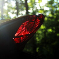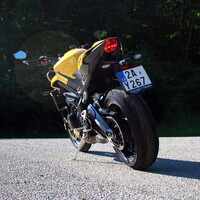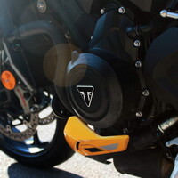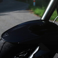 Nový vzhled s protáhlými zamračenými světlomety a ostře řezanými linkami vytváří agresivní dojem, ale tak nějak s grácií. Nutno říct, že můj postarší kousek s velkými vykulenými kukadly v tomhle ohledu už působí patřičně zastarale. Ne, že bych ho neměl rád, ale už když jsem ho kupoval, se mi zamlouval novější – zamračenější design světel. Chladič je tenčí, zato rozměrnější, díky čemuž ještě o kousek více trčí do stran. Nádrž je užší, takže ji můžete koleny lépe sevřít a pro jezdce pak motorka působí hubenějším dojmem. Bohužel také pozbyla dva a půl litru svého objemu, takže je potřeba mít na pozoru. Další velkou změnou je zkrácení a přemístění koncovky výfuku. Pobláznění s výfuky pod sedlem po přelomu milénia již naštěstí opadlo. Nyní ho najdeme klasicky na boku, nebo spíše až pod motorkou. Výfuky pod sedlem možná dobře vypadají, ale na druhé straně je vám díky nim trochu tepleji a také uchycení čehokoliv je o něco komplikovanější. Drobné zakopnutí by mohly být povinné odrazky u předního kola. Není tomu dávno, co jsem se rozplýval nad evropskou elegancí. Vidle do zad zrovna od Triumphu jsem přitom vážně nečekal. Sice jen jeden šroubek, minutka práce, žádné velké drama, ale i z výroby to jde lépe.