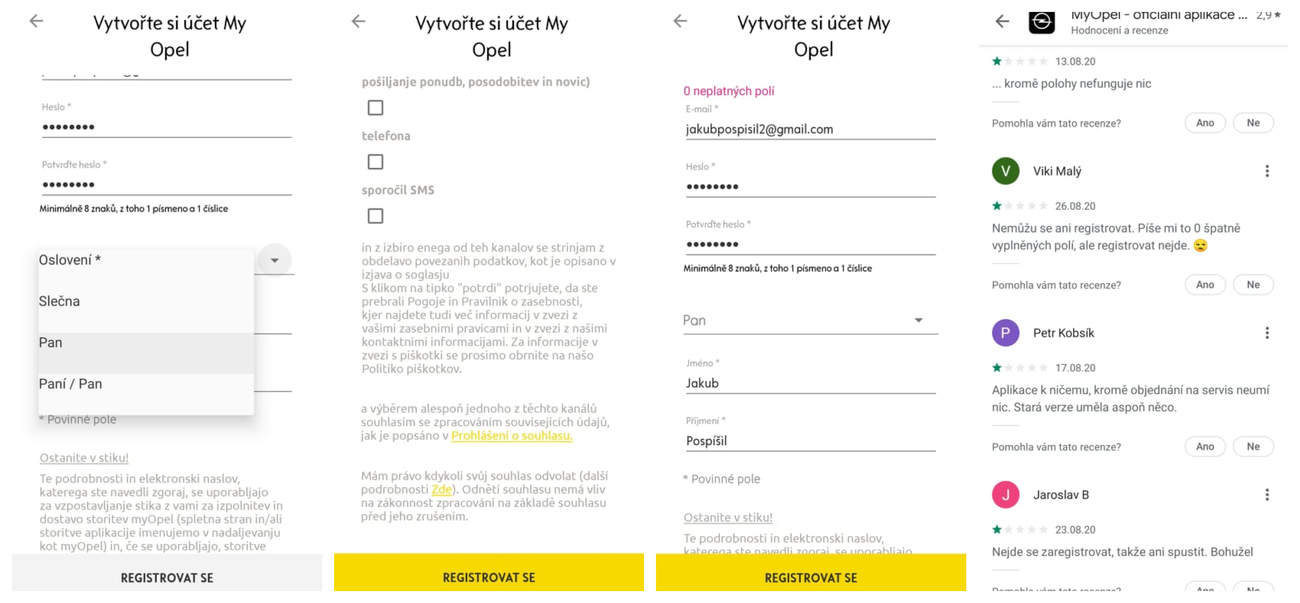 Teoreticky bych mohl úroveň nabití sledovat vzdáleně v aplikaci MyOpel, jenže prakticky to tak úplně nejde. Problém nastal hned při registraci a přihlášení.Prvním varováním mi měla být poněkud specifická volba oslovení, kdy mohu být buď pán a paní současně, nebo případně slečna, nebo samostatný pán. Věrohodnosti nepřidalo ani ustanovení o GDPR vyvedené ve slovinštině, i když jsem se zase dozvěděl, že internetové “cookies” jsou slovinsky “piškotky”, což je super. Nicméně i když jsem s politikou piškotkov souhlasil, dozvěděl jsem se jen, že mám “0 neplatných polí” a tím to zhaslo. Smůla, dál to prostě nejde. Zkoušel jsem různé maily, různá oslovení, různá hesla, ale prostě to nefunguje. A podle hodnocení z Google play bohužel nejsem zdaleka jediný, kdo má problémy. Je to škoda, taková appka by byla super, ale tohle je odladěné jak palubní software škodovky…