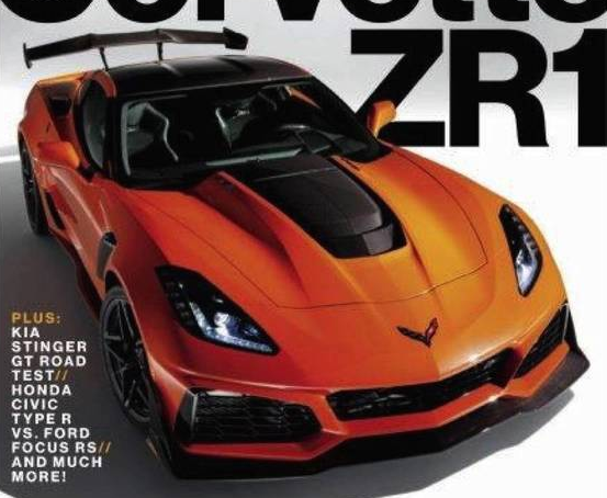 Jak je vidět na přebalu magazínu, nejmocnější Corvette dostala nový přední nárazník, novou kapotu s vloženou černou částí a také obří křídlo, zvyšující přítlak na zadní nápravě. Uvnitř to zcela nepochybně vypadá na skořepinová sedadla, a jak hlásá nápis nad snímkem auta, bavíme se tu o 750 koních výkonu.