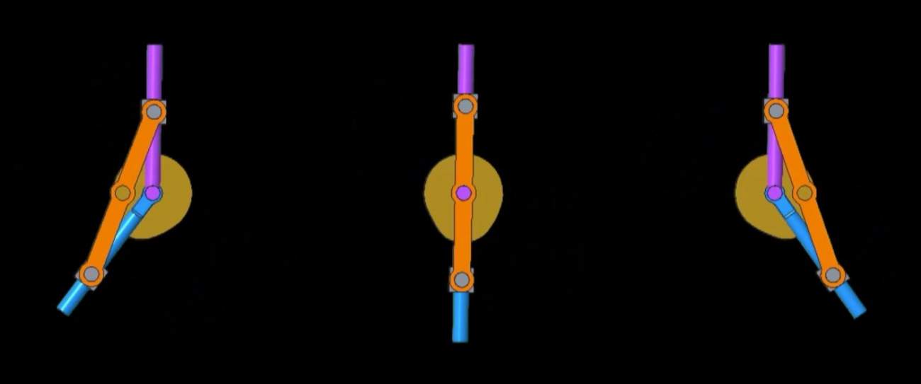 Takže se to pokusím popsat svými slovy: Otevřete si to video odkazované nahoře a najděte si čas 6:47. Nebo obrázek výše no. Oranžově je ten vychýlený střed, fialově, nebo co to je za barvu, je v podstatě pozice vačky a modře kam se nám posunul náš nově načasovaný výčnělek. Prostě jde o to, že když se to oranžové dobře posune, tak to fialové s tím modrým musí v jisté fázi rychle švihnout a to je ta změna času. Děje se tak jen půl otáčky, zbytek se pak ona modrá věc zase sune pomalu.