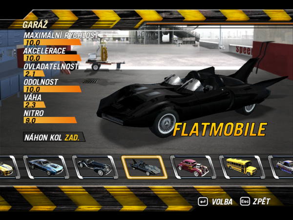 Je v něm sice většina aut reálných, akorát s vymyšelnými jmény, ale takový Flatmobile je něco, co bych si určitě vyzkoušel! Jeho tryskáčové zrychlení a absolutní neschopnost trefit kohokoliv dalšího při demoličním derby jsou nezapomenutelné :-)