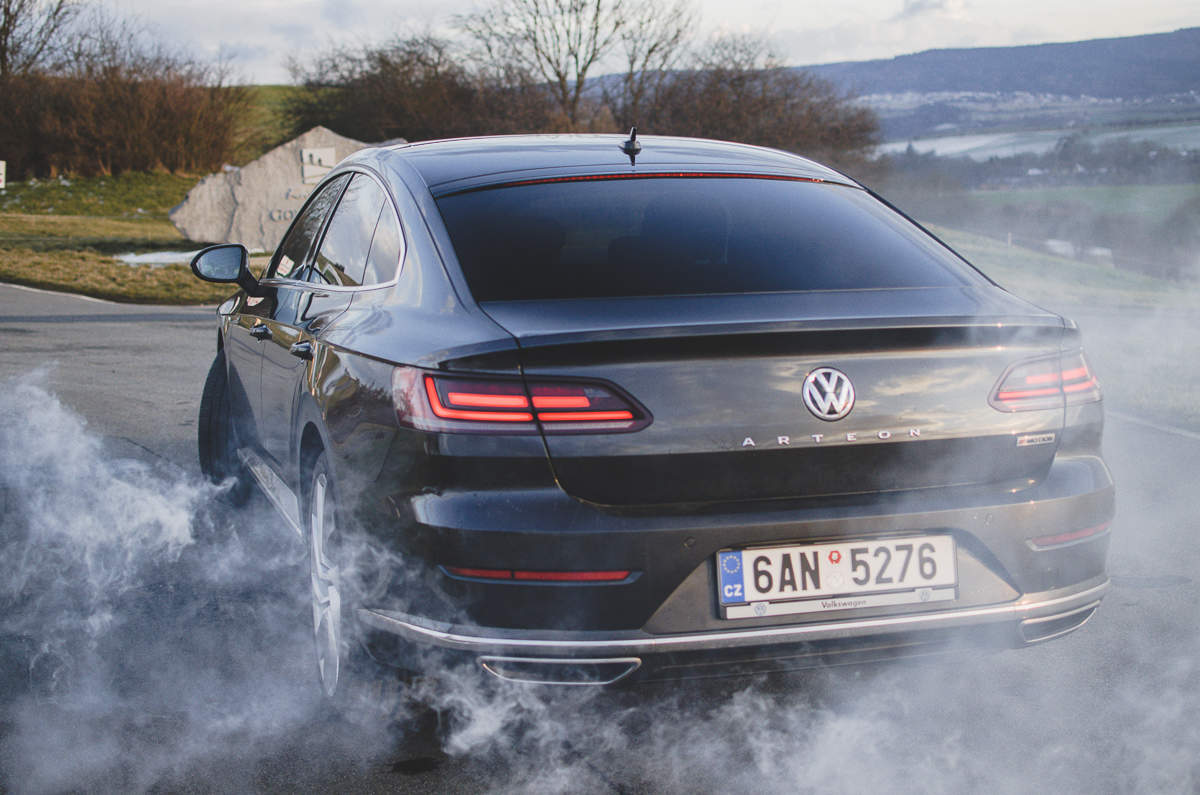 Výsledkem je, že jízda je, zvláště na menších a ostřejších nerovnostech, poněkud tvrdá a auto zvláště v tvrdší části rozsahu nastavení tlumičů (DCC u Arteonu umožňuje namísto běžných tří režimů tuhosti plynulé nastavení ve více než deseti úrovních) reaguje na rázy ostrými otřesy. Problém přitom očividně není v podovzku samotném – měkčí úroveň je dostatečně poddajná k tomu, aby se auto na nerovnostech pohupovalo, ale skrze nízké bočnice pneumatik se do kabiny stále přenášejí rázy. Řešení? Vyberte si menší kola. Devatenáctky by měly být znatelně pohodlnější a přitom nebudou vypadat o tolik hůř.