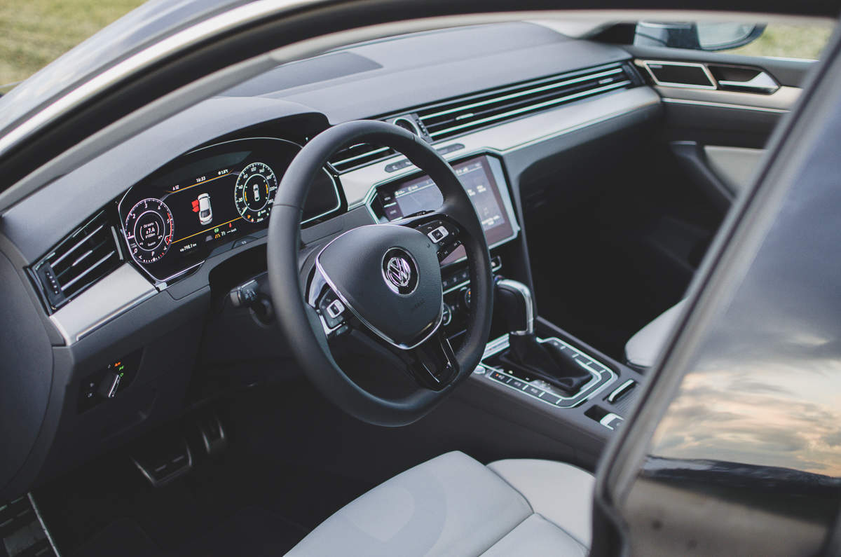 Zbývá tedy interiér. Dává Arteon svůj status vlajkové lodi značky najevo i v kabině? Připomíná vám, že jste si pořídili výjimečný model? Upřímně řečeno, ne tak docela. Poslední okamžik, kdy skutečně nemůžete zapomenout, do čeho nasedáte, nastane při zavírání dveří. Bezrámová okna jsou prostě cool a vždycky cool budou. Ale jakmile jsou dveře zavřené, připomíná vám rozdíl oproti Passatu vlastně jen nižší a rozmáchlejší linie stropu. Což není nijak propastný rozdíl. Samozřejmě tu jsou i detaily jako modernější radiomapa s dotykovým ovládáním na displeji místo tlačítek kolem něj (stejná, jakou známe z Golfu) nebo digitální palubní deska (kterou také známe z Golfu). Zbytek, včetně působivých mřížek ventilace protažených přes celou šířku palubní desky, je s Passatem víceméně identický – a můžeme téměř s jistotou očekávat, že zbytek dorazí při jeho faceliftu.