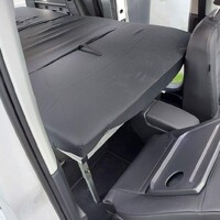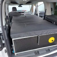 A teď už rychle k tomu, co by mělo tenhle Caddy odlišovat od ostatních nudných bílých (základní bílá Candy známá z fleetových Fabií je tu za příplatek lidových 5977 Kč) krabic v provozu. Zavazadlový prostor tu vyplňuje tzv. Kombibox – zařízení, které zdálky i zblízka připomíná bednu na koncertní aparaturu, kterou s sebou vozí zvukaři, dokonce jsem přesvědčen, že základem pro tento vehement se taková bedna opravdu stala. Zde je ale navíc doplněna o tři kusy bílého molitanu, kryté černou bavlněnou látkou a přichycené patentky k překližkovým deskám. Uvnitř se po otevření nachází dvojice šuplíčků, dva plastové kanystry, univerzální gastronádoba a výklopný kousek ohýbaného plechu sloužící jako závětří pro vařič.