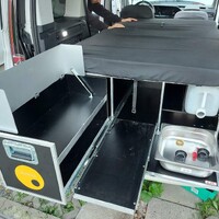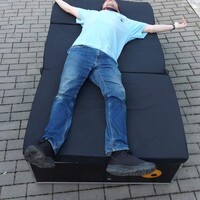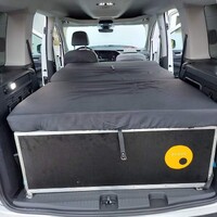 Postel je určena pro dvě osoby, avšak troufnu si říci, že pro pohodlné přespání poslouží spíše jen jednotlivci. Níže můžete toto tvrzení ověřit na ilustrační fotografii, kde jako figurant slouží Jan Machač, toho času pravděpodobně nejrachitičtější (a také vzrůstově nejnižší) člen naší redakce. Mám-li za sebe vypíchnout jednu věc, kterou mě Kombibox opravdu potěšil, je to skutečnost, že šel z vozu snadno vyndat a díky masivním výklopným držadlům zvukařské bedny snadno odnést do garáže. Oproti konkrurenčnímu řešení od Egoe je o trochu snazší instalace postele, na druhou stranu tu ale kromě dvou kanystrů a univerzální nerezové nádoby nenajdeme prakticky žádné vybavení, materiál matrace je o dost lacinější a box působí mnohem smutnějším dojmem. Chybí tu i praktické výklopné stolky, nemluvě o vymoženostech, jakými byla sprcha a dřez s kohoutkem, integrovaný vařič nebo lednice. Na druhou stranu jde ale o vybavení nabízené přímo Volkswagenem, tudíž mu odpovídá i cena. Ta je stanovena na baťovských 99 tisíc a 240 korun k tomu.