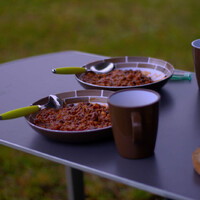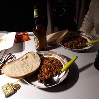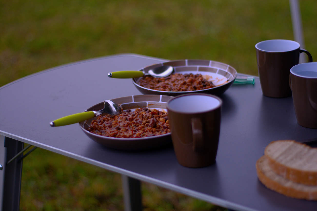 Při předávání mi tvrdili, že se tu sice teoreticky dá vařit, ale zatím tu každý dělal tak maximálně kafe. Já se s něčím takovým odmítám smířit a proto na opuštěnou promočenou louku dorážím vybaven dvěma plechovkami fazolí (červené a bílé v nálevu), půlkilem mletého vepřového, plechovkou nakládaných papriček chipotles, česnekem, cibulí, kajenským pepřem a pár dalšími drobnostmi. Prý že tak maximálně kafe. Já budu dělat chili con carne!